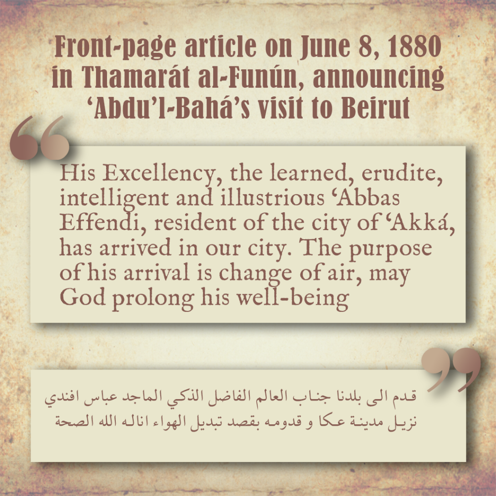 A graphic design of a headline run by a Lebanese newspaper a few days after ‘Abdu’l-Bahá’s arrival in Beirut and a teaser graphic for a marvelous article by Necati Alkan entitled Midhat Pasha and ‘Abdu’l-Baha in ‘Akka: The Historical Background of the Tablet of the Land of Bá