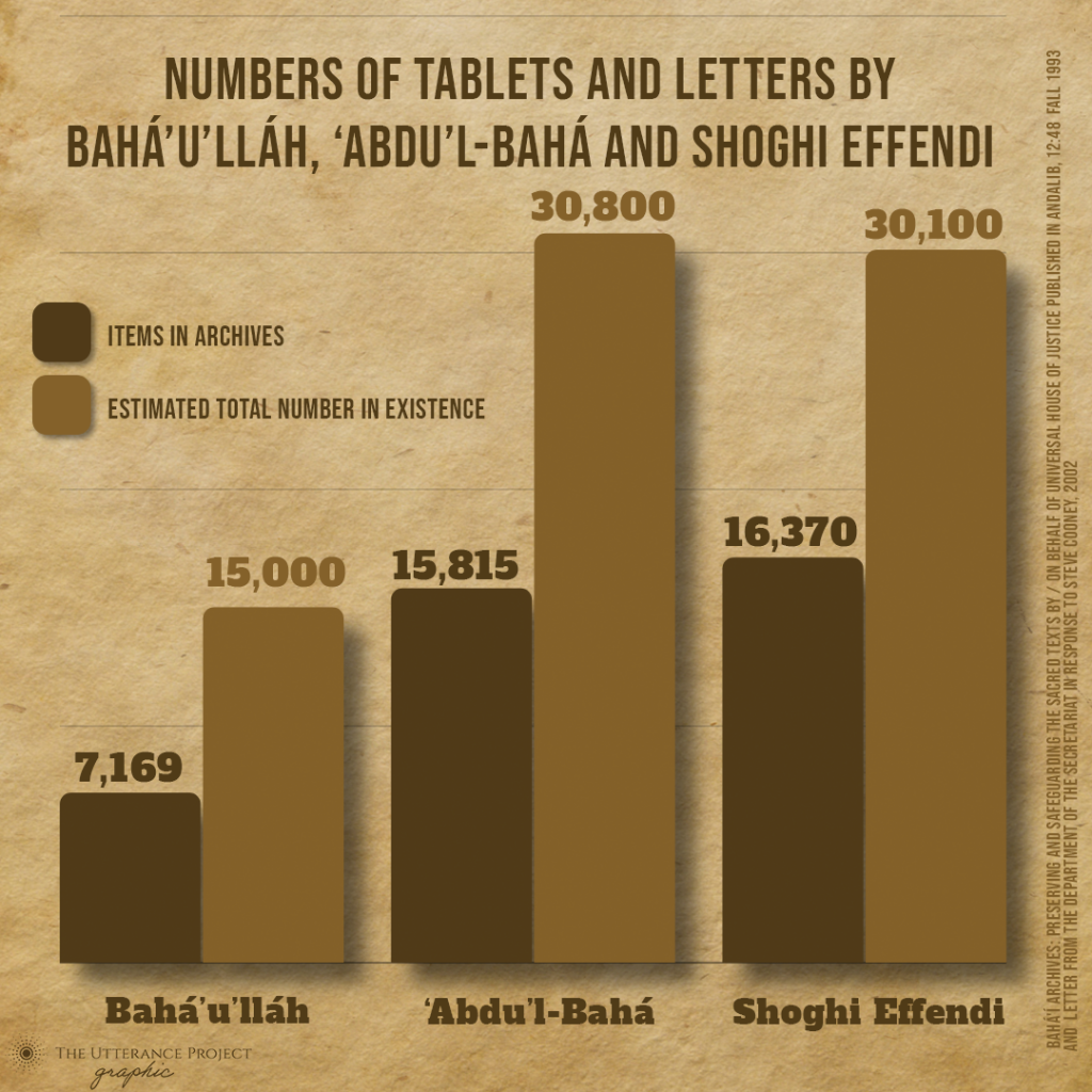 The first infographic shows the volume of Tablets and letters written by all three Central Figures of the Bahá’í Faith, Bahá’u’lláh, ‘Abdu’l-Bahá and Shoghi Effendi.