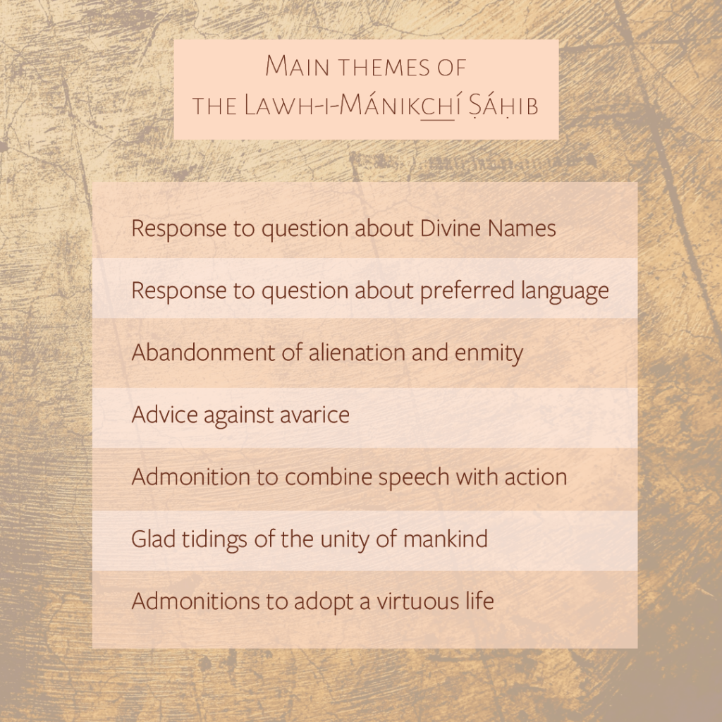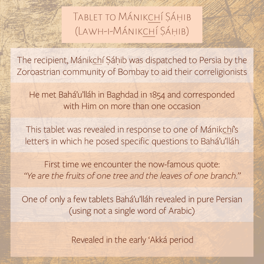 The information in the graphics was drawn from an article by Ramin Neshati called “Baha’u’llah’s Tablet to Mánikchí Sáhib: Introduction and provisional translation” which was published in Lights of Irfan, Book 3, pages 121-128 Wilmette, IL: Irfan Colloquia, 2002.