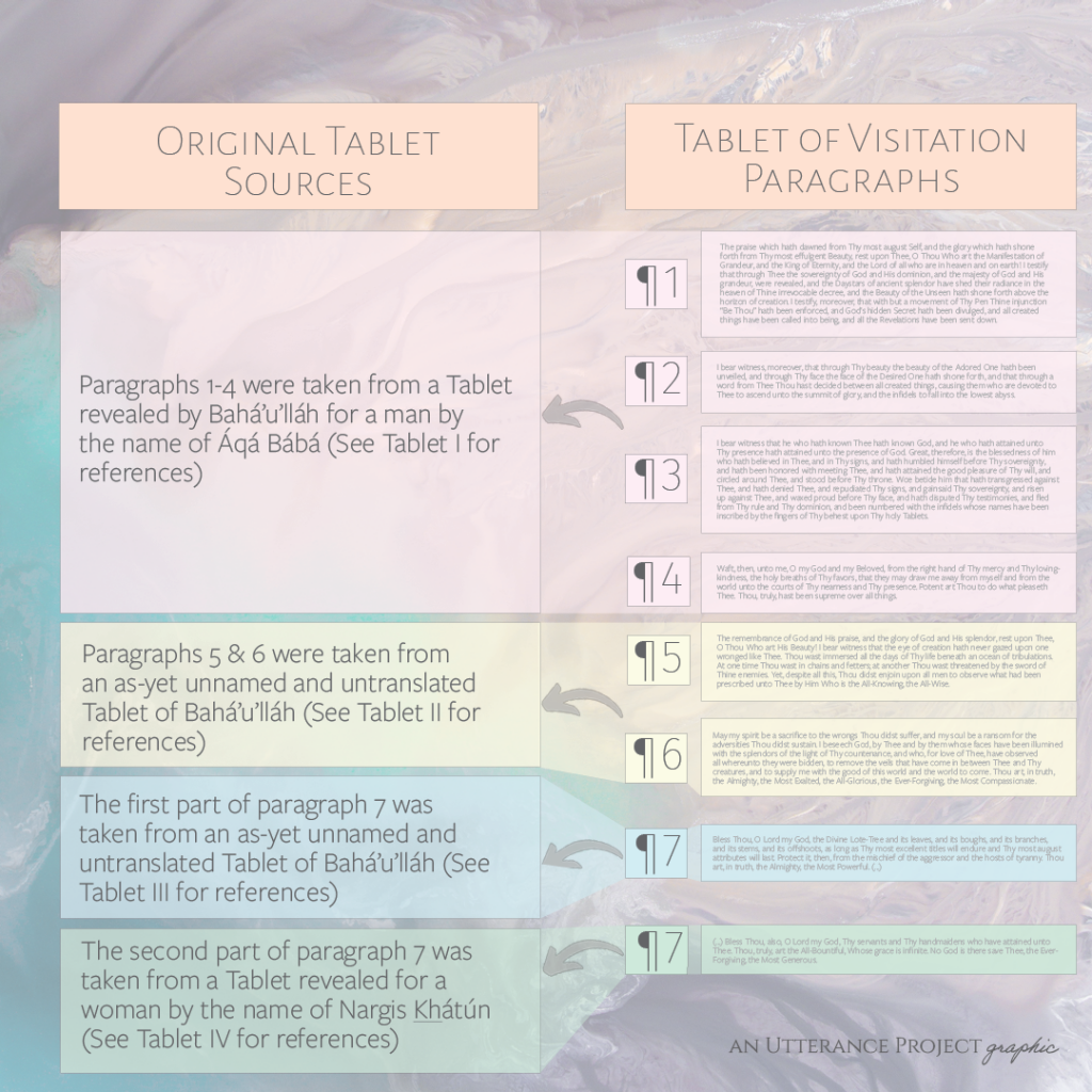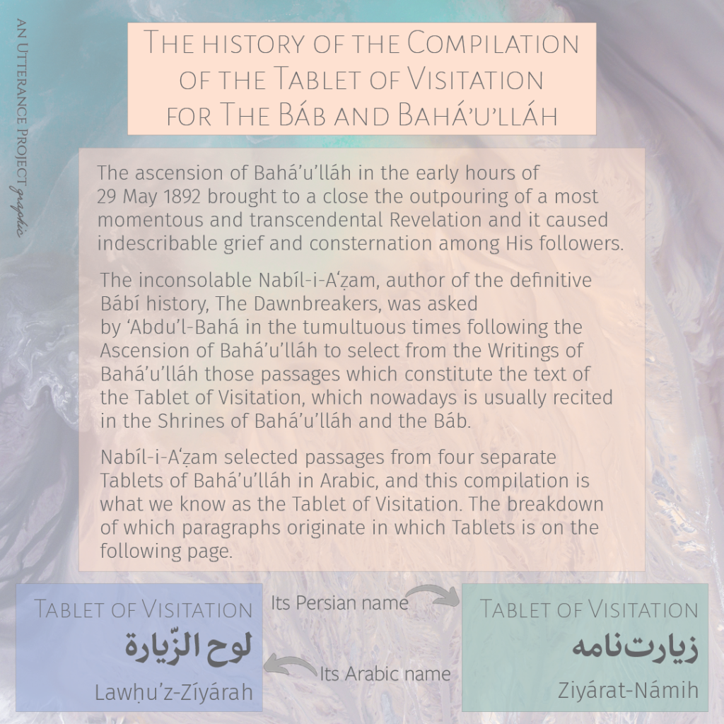It is our great pleasure to offer you, as a supplement to the publication of the Tablet of Visitation for Bahá’u’lláh and the Báb on the eve of the commemoration of the Ascension of Bahá’u’lláh, a graphic explaining the fascinating circumstances surrounding the compilation of this Tablet of Visitation.