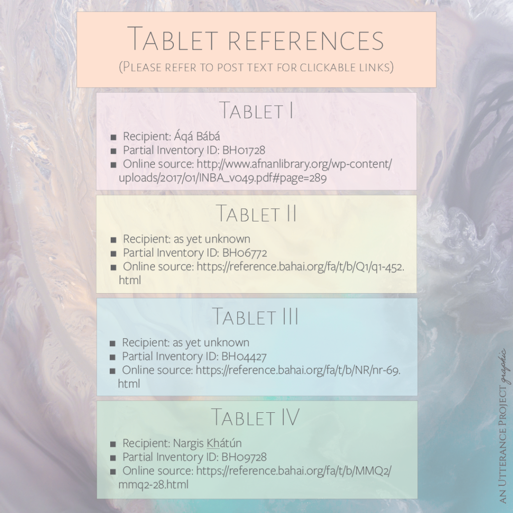 The clickable links referred to in the graphic below for the source of the original four Tablets of Bahá’u’lláh are listed below: