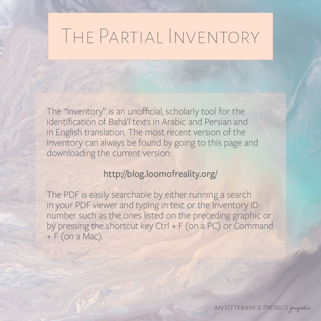 “an unofficial catalog of over 650 works attributed to the Báb, 11,600 works attributed to Bahá’u’lláh, and 11,800 works attributed to ‘Abdu’l-Bahá which are accessible to the public, either in published form, in manuscripts held in national or institutional archives, or in digital images, texts and translations found on the Internet. The holdings of the Bahá’í World Centre Archives in Haifa, Israel, which are not open to the public, are not included.”