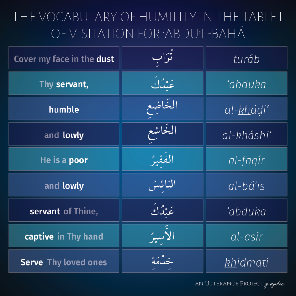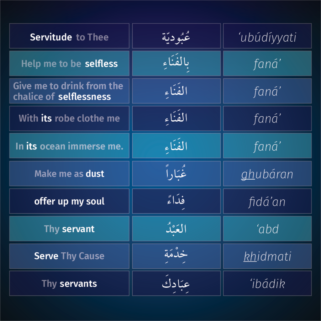 An especially fascinating feature of this prayer is lost in the translation of this passage: “Give me to drink from the chalice of selflessness; with its robe clothe me, and in its ocean immerse me.” In the original Arabic, the word faná’ (“selflessness”) is actually repeated three times in each of the three supplications in this sentence, but presumably to avoid redundancy in English, Shoghi Effendi translated the second and third instances of this word as simply “its.”