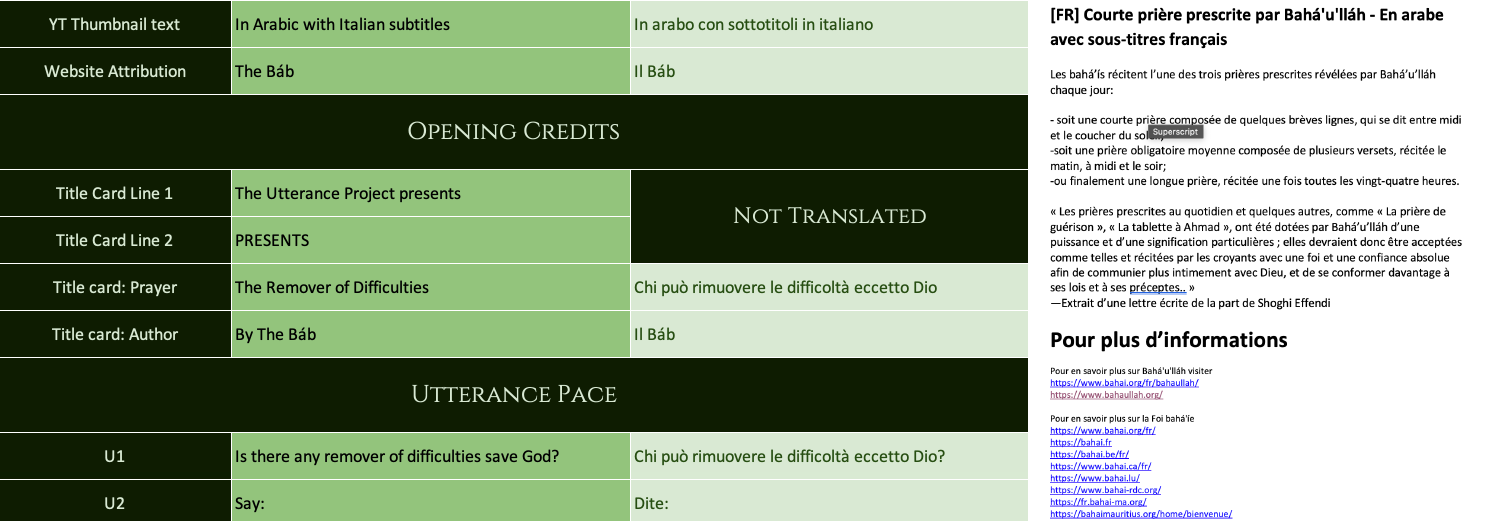 - An Excel Spreadsheet with all the text you find in the video, on the YouTube thumbnail, in the opening credits, in the verses for the prayer, in the transition card between the two recitation paces, and in the end credits. The prayer is never translated, you simply copy the latest official published version approved by your National Spiritual Assembly; you may copy it from one of the only Bahá'í Prayer sites but it must match what is the latest approved published prayerbook;