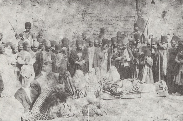 Bábís gathered around the body of a martyr. Source: Nabíl, The Dawn-Breakers, page 611.