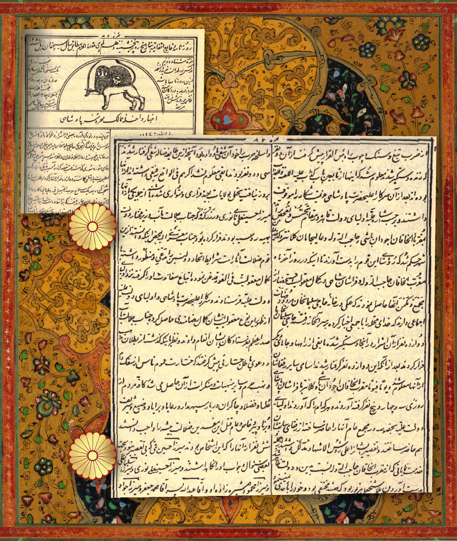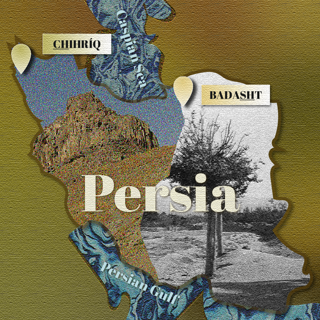 Spiritual energies at play: Map of Persia at the moment of the conference in Badasht, showing the location of the Báb in Chihríq. Image for the left half of the map of Persia: Chihríq fortress from Wikimedia Commons; Image for the right half of the map: the village of Badasht, © Bahá'í International Community, Bahá'í Media Bank. © Violetta Zein.
