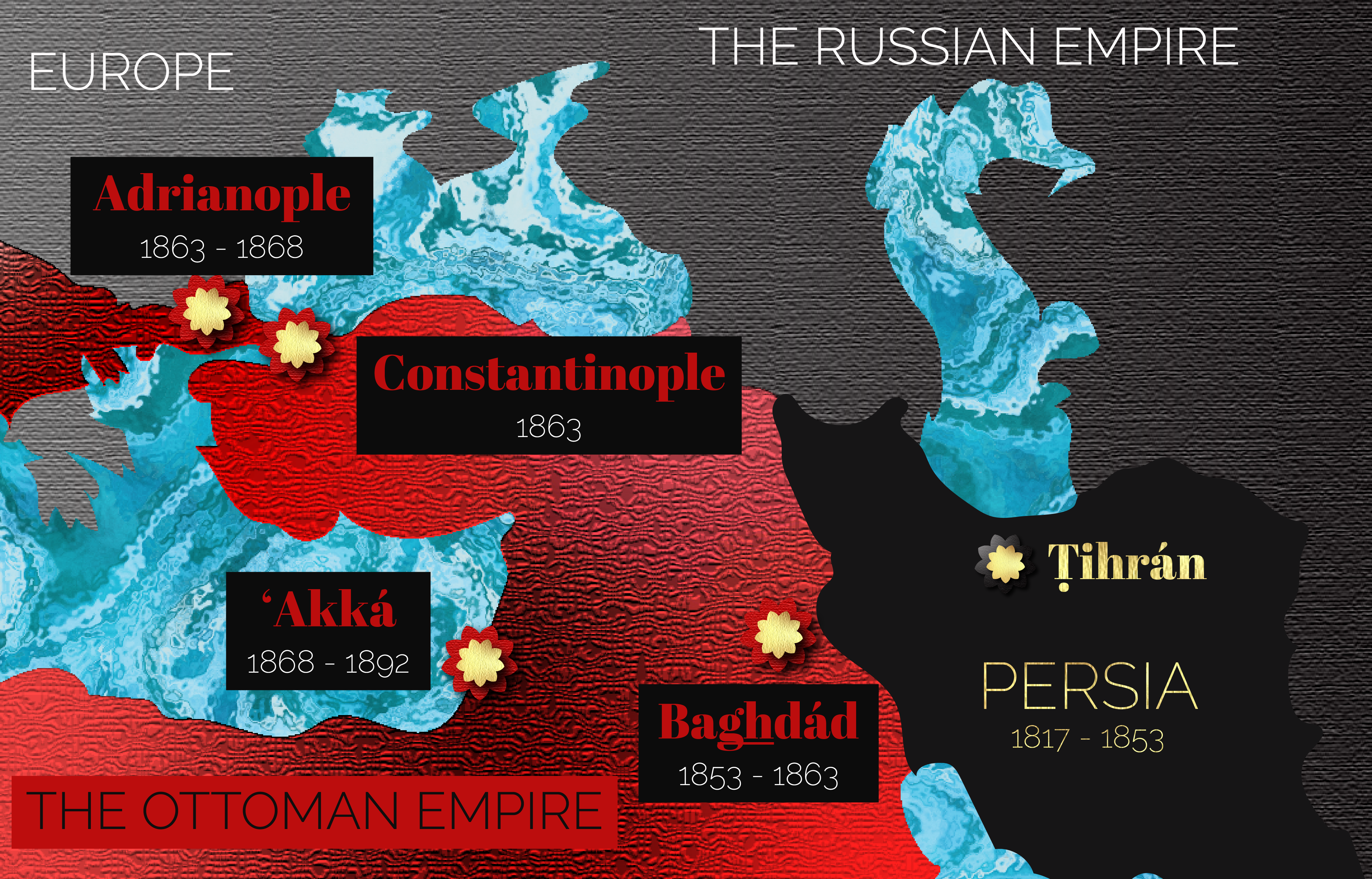Map showing the four locations of Bahá'u'llá's successive banishments from His homeland. © Violetta Zein.