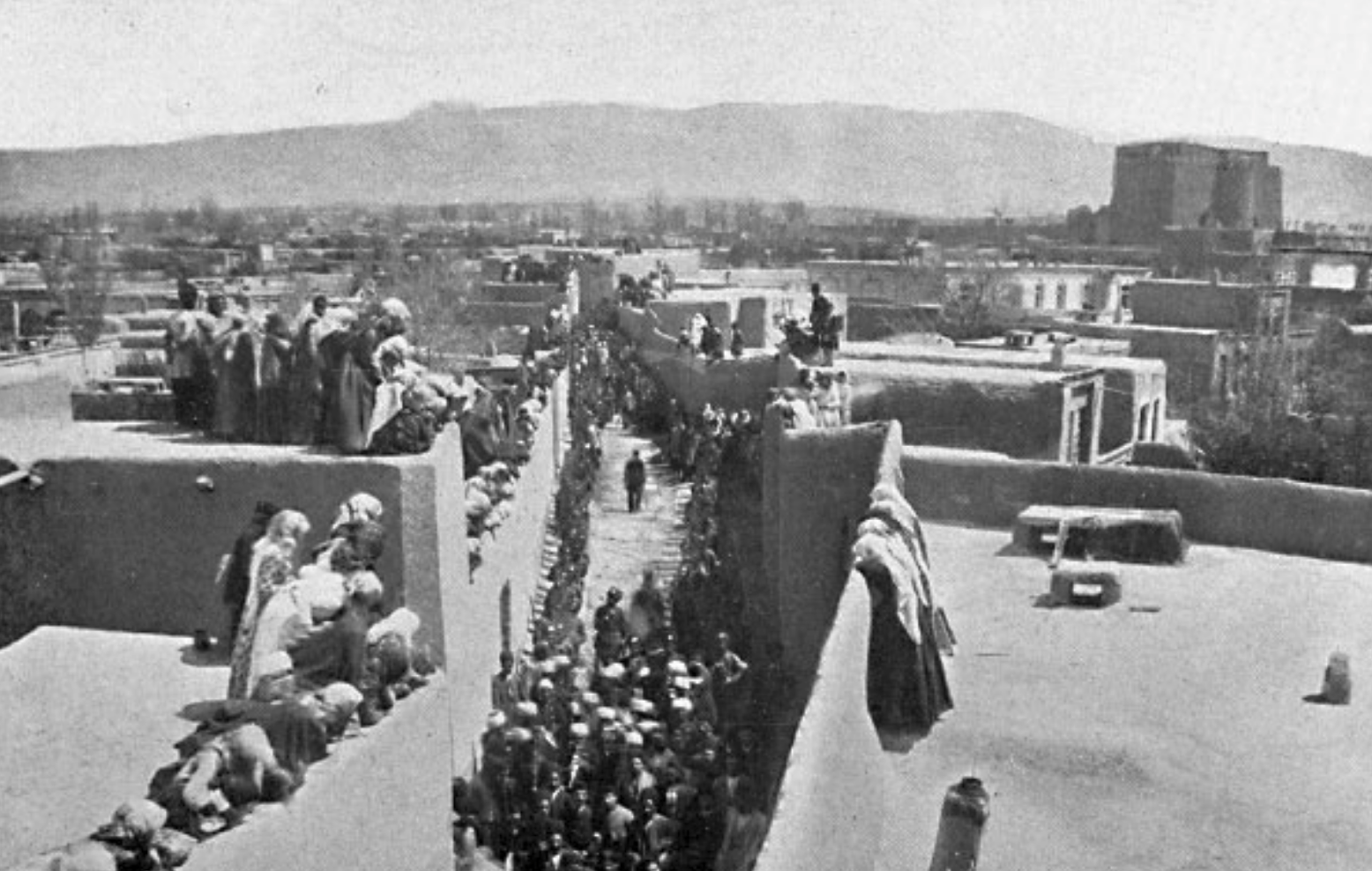 A crowd moving through the streets of Tabríz in 1890, offered as an illustration of what mob scenes would have looked like through Persian in the 1850s and particularly in the story about 'Aẓím's mob attack below. © Bahá'í International Community. Source: Official Website of the Bahá'í International Community: The Bábí Movement.