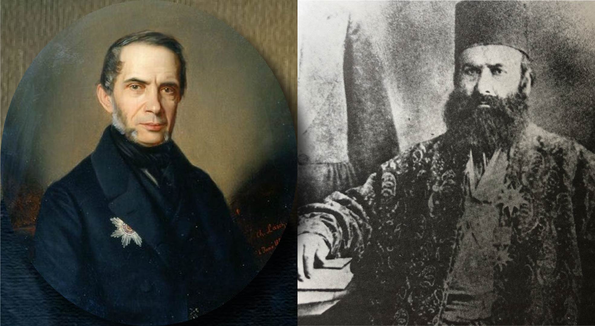 Left: The Russian minister in Persia from 1845 to 1854, Dimitri Ivanovich Dolgorukov by Carl Johann Lasch, 1855. Source: Wikimedia Commons. Right: Mírzá Majíd-i-Áhí, secretary to Prince Dolgorukov and brother-in-law of Bahá'u'lláh. Source: H.M. Balyuzi, Bahá'u'lláh: The King of Glory, page 100.