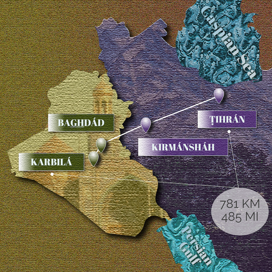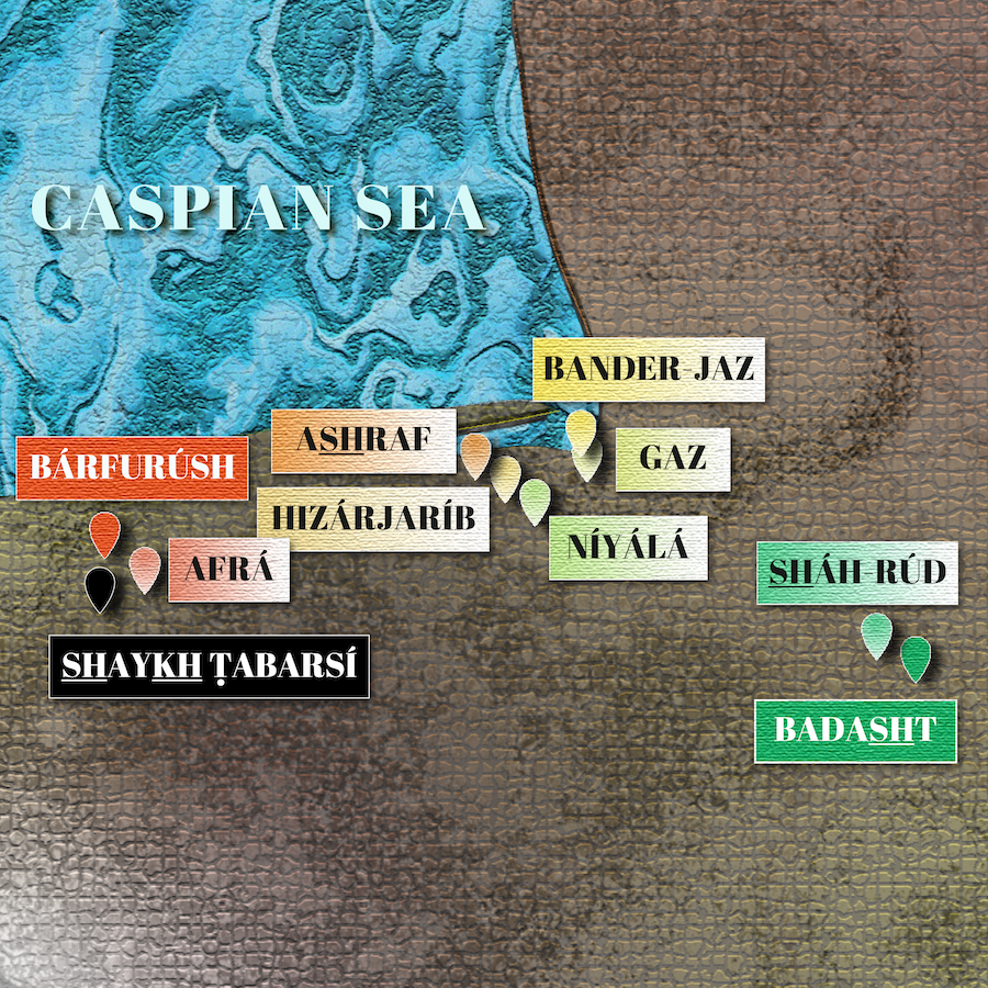 Map of Bahá'u'lláh's journey towards Shaykh Ṭabarsí inspired from the map in H.M. Balyuzi's book Bahá'u'lláh: The King of Glory, page 38. The missing location for the district Hizárjaríb was found on Google Maps. © Violetta Zein.