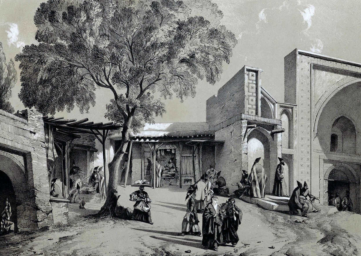 Marketplace and mosque entrance in Qazvín in 1840. Engraving by Eugène Flandin, published in Voyage en Perse, avec Flandin (1851) . Wikimedia Commons.