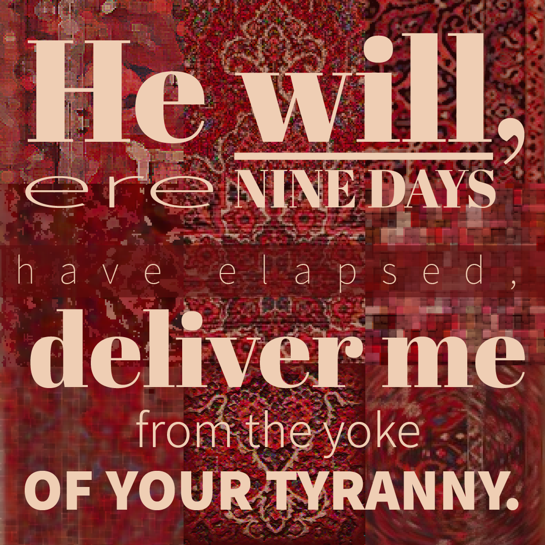 Bloody reprisals were taking place in Qazvín as the family of Ṭáhirih's murdered cousin, Ḥají Mullá Taqí, hunted down and killed Bábís. When they announced their plan to kill Ṭáhirih as well, she prophesied, despite being under house arrest, "If my Cause be the Cause of Truth, if the Lord whom I worship be none other than the one true God, He will, ere nine days have elapsed, deliver me from the yoke of your tyranny.”