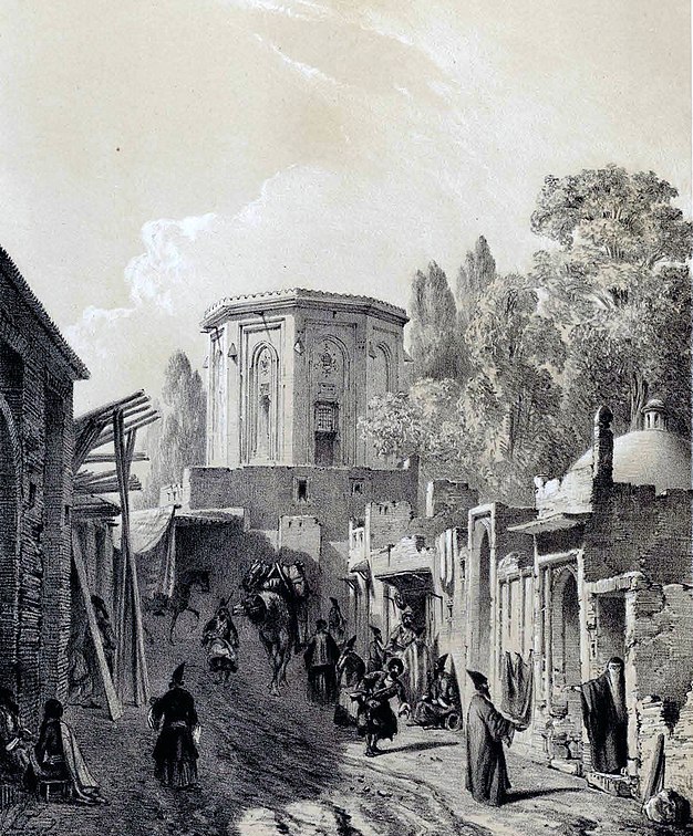The streets of Ṭihrán in 1840. Engraving by Eugène Flandin, published in Voyage en Perse, avec Flandin (1851) . Wikimedia Commons.
