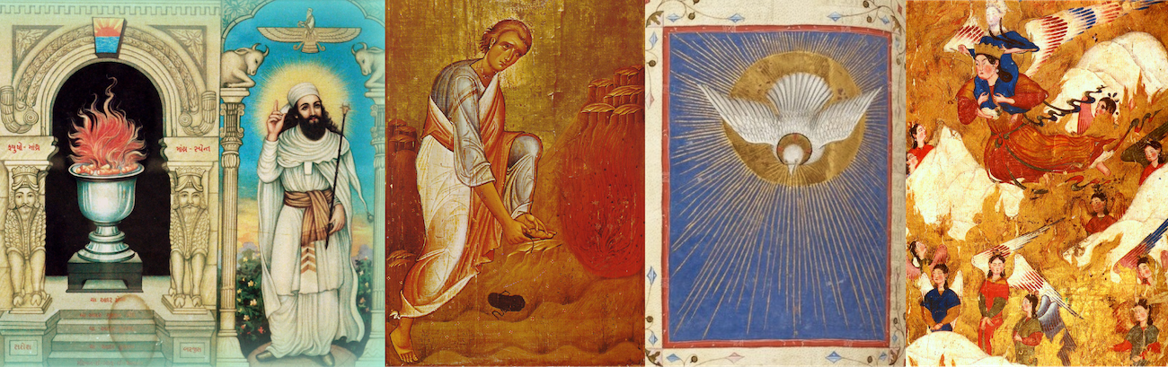 The Holy Spirit in the Bahá'í Faith is personified by the Maid of Heaven. This collage series honors past Dispensations and their personifications for the Holy Spirit. From left to right: First image: The Holy Spirit in Zoroastrianism: A (cropped) mural in Yazd depicting Prophet Zoroaster and a replica of the afarganyu, the Holy Fire burning in every Zoroastrian Fire Temple. Source: Quora forum. Second image: The Holy Spirit in Judaism: 12th century gilded icon depicting Moses and the Burning Bush on Mount Sinai. Source: Wikimedia Commons. Third image: The Holy Spirit in Christianity: 14th century folio from a liturgical manuscript depicting The Holy Spirit, in the form of a dove, created by Giovanni di Benedetto and his workshop. Held by Bibliothèque nationale de France. Source: Ad Imaginem Dei: A Dove Descending (31 May 2020). Fourth image: The Holy Spirit in Islam: 14th century painting of the Angel Gabriel appearing to Prophet Muḥammad, by Aḥmad Músá.. Source: Wikimedia Commons.