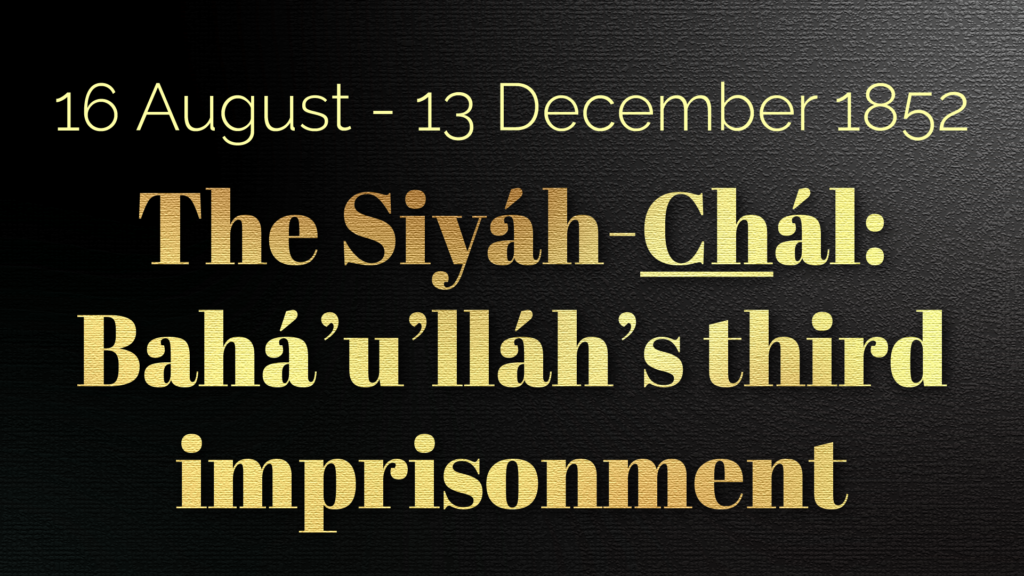 Three foundational major events in Bahá'í history took place in 1852 – 1853: Bahá'u'lláh was imprisoned in the Siyáh-Chál for four months, the Bábís in Persia were massacred on an unimaginable scale, in both savagery and sheer numbers, and third, the Bahá'í Faith was born.