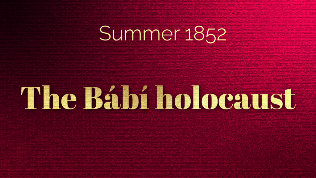 The spiritual forces at play during this intensely violent yet glorious year are foundational to our Faith. The section is called the Bábí holocaust in tribute to Shoghi Effendi’s term for it, but also because the blood-thirsty tsunami of hatred and retribution that swept through Persia after the attempt on the Sháh’s life was aimed at wiping out the Bábí Faith.