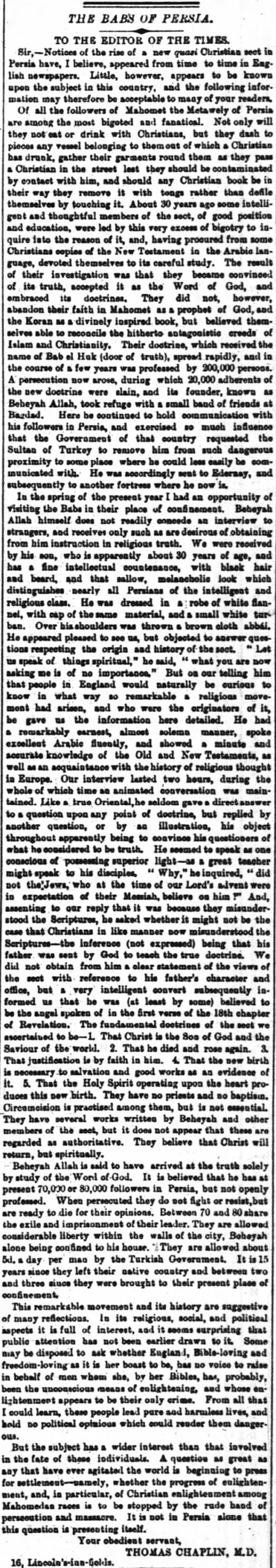 The result of Dr. Chaplin’s meeting with 'Abdu'l-Bahá was, according to Dr. Moojan Momen, the first extended commentary on Bahá'u'lláh and the Bahá'í doctrine in western newspapers, though Dr. Chaplin calls the Bahá'í Faith "the Babs.” The article, published on page 8 of the Times of London, on 5 October 1871, was titled The Babs of Persia. This article is also valuable for what is perhaps the very first western pen-portrait of 'Abdu'l-Bahá at the age of 27, two years before His marriage, seen through the eyes of a 19th century Londoner.