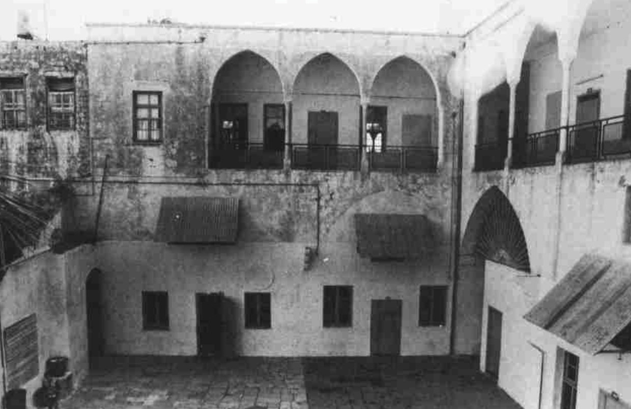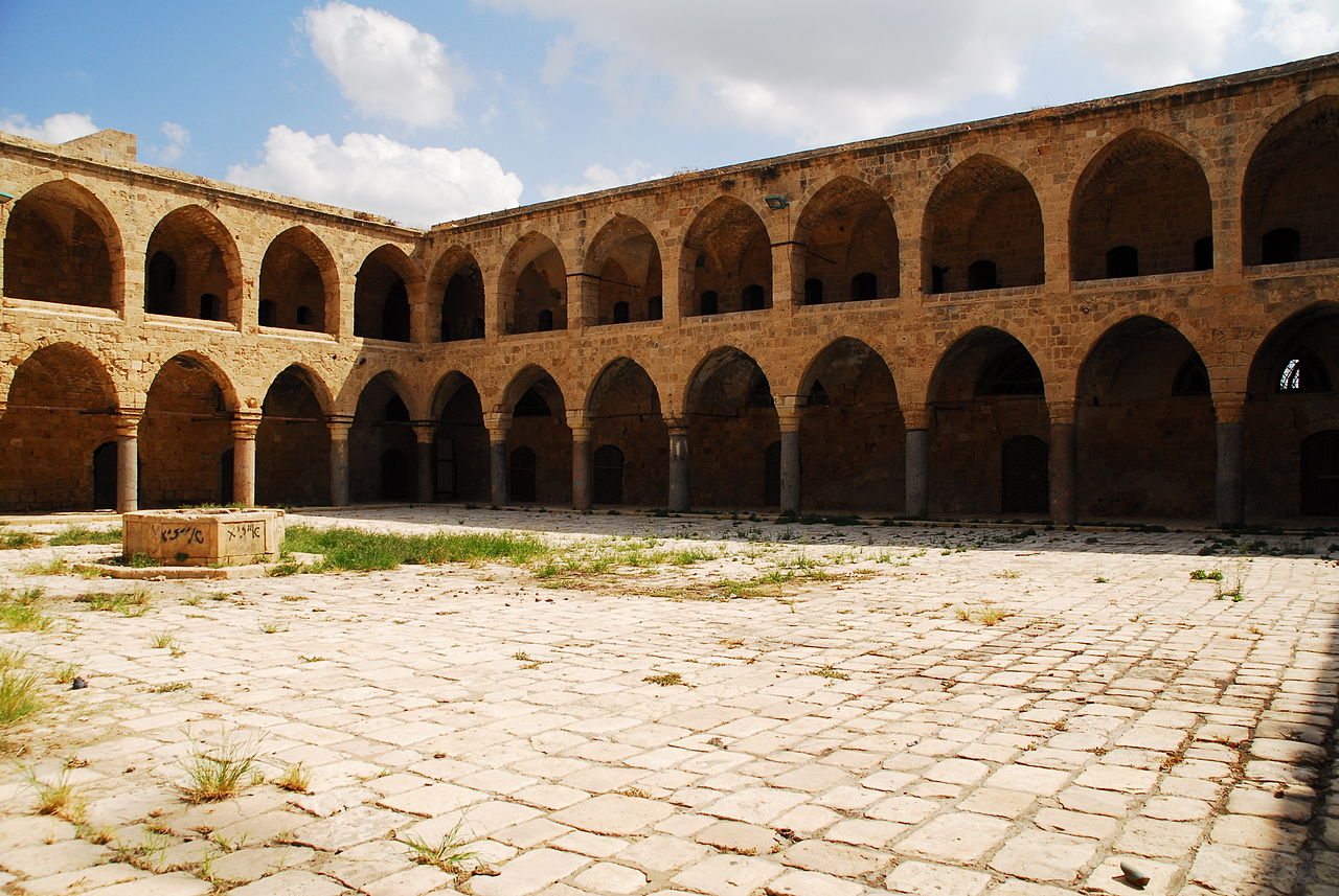 In November 1870, the majority of the Bahá'í exiles in the Most Great Prison were relocated to a caravanserai called the Khán-i-'Avámíd, built at the harbor edge, north of the sea-gate in the south-eastern quarter of ‘Akká. Jazzár Páshá had built the Khán-i-'Avámíd in 1875, and the caravanserai was also known as the “Inn of the Pillars,” for the impressive colonnade of granite pillars, taken from the Roman ruins at Caesarea, surrounding its courtyard.