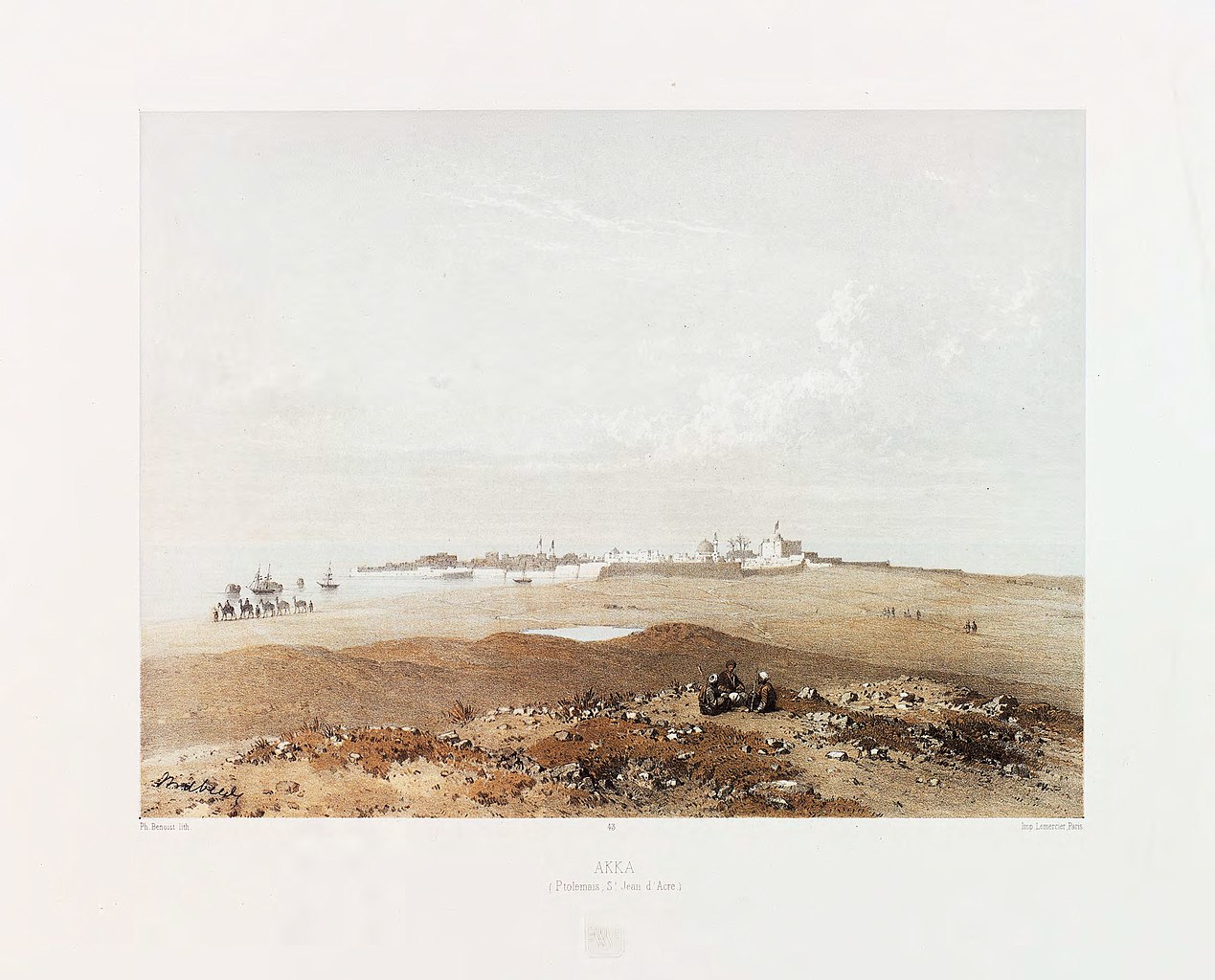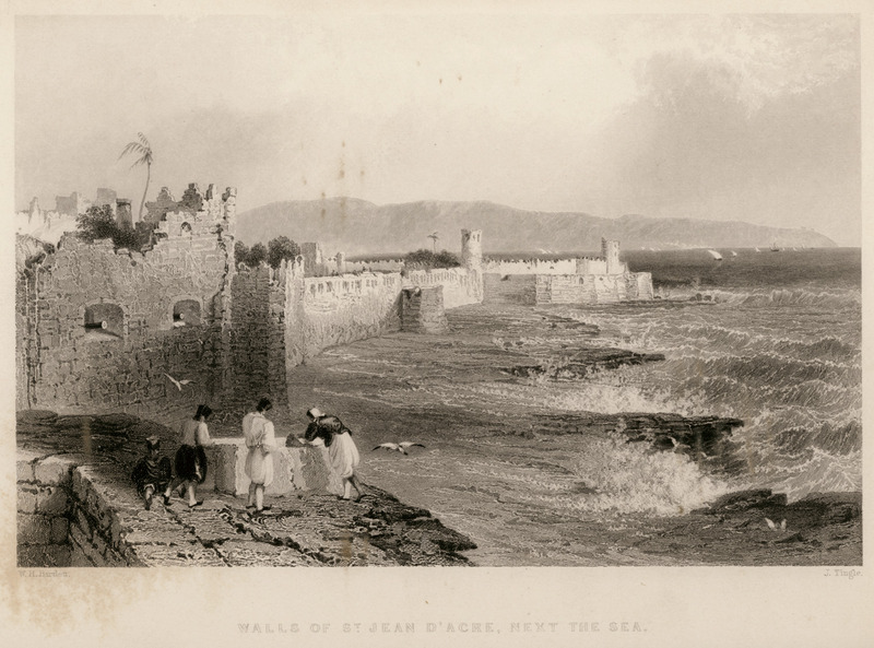 1857 watercolor of the peninsula of ‘Akká seen from land, with the Mediterranean sea spanning from the west to the east. Source: Wikimedia Commons, originally from Charles William Meredith van de Velde's Le Pays d'Israel.