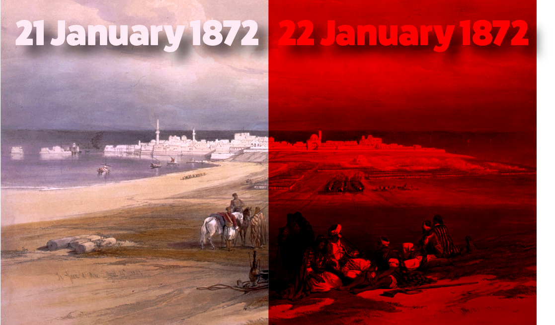 To illustrate the speed with which ‘Akká was overtaken by the crisis, and how quickly Bahá'u'lláh’s prophecy below came true, a before/after split-processed image, ‘Akká on 21 January, and ‘Akká on 22 January 1872. Original image: Color lithograph of a view of St. Jean d'Acre (‘Akká) from land on 24 April 1839 by David Roberts, published in The Holy Land, Syria, Idumea, Arabia, Egypt and Nubia. Source: Wikimedia Commons. © Violetta Zein.