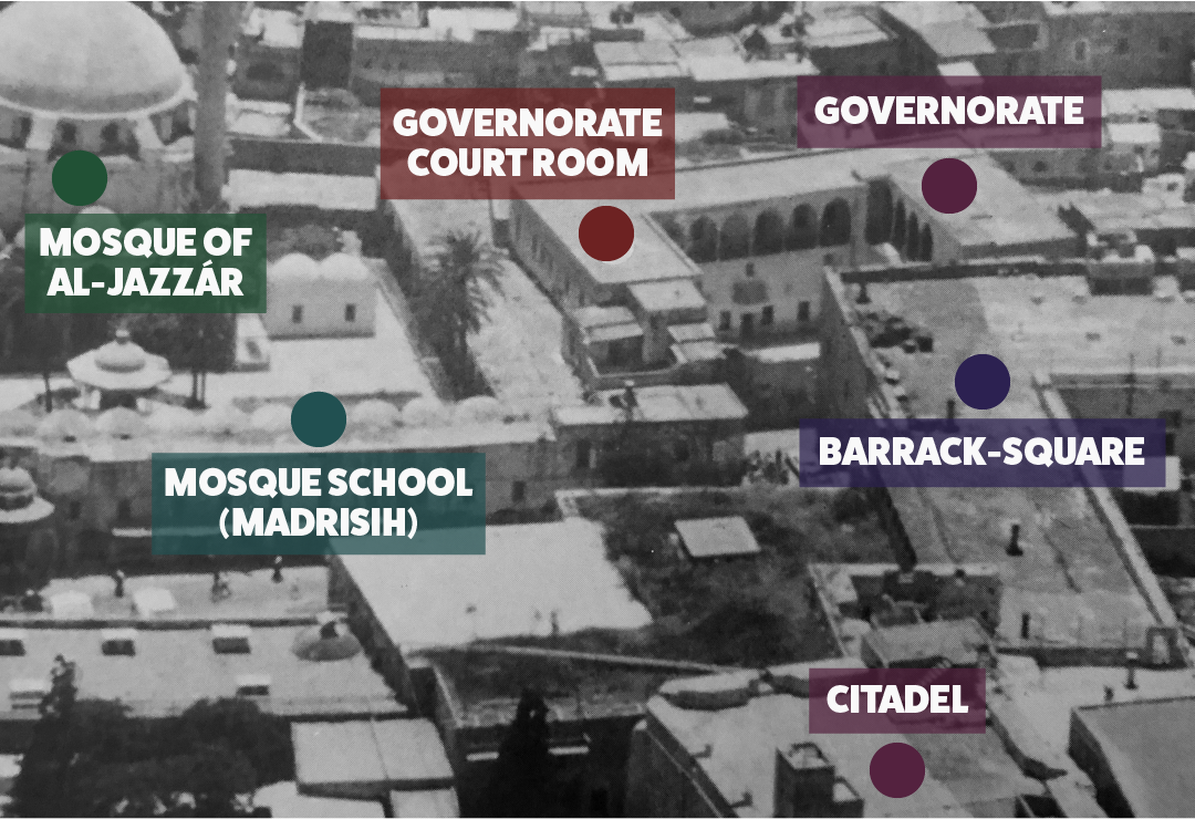 A view of the house of ‘Údí Khammár from Genoa Square, located in the rear of the building now known as the House of ‘Abbúd. The arched doorway on the right opens to the staircase to the second and third floors. Source: The life of Bahá'u'lláh: A photographic Narrative: Bahá'u'lláh leaves the citadel.
