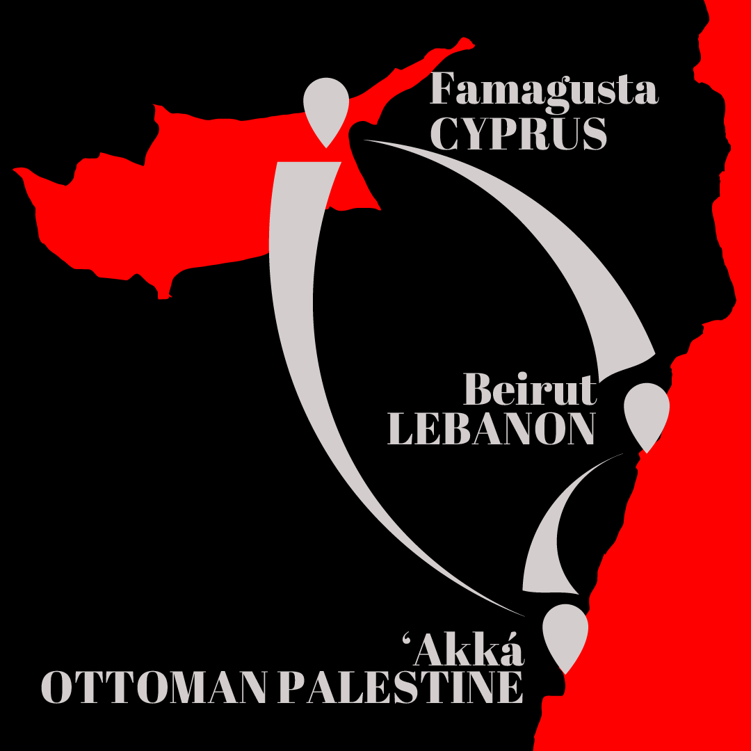 A stylized map of the journey of Na’im Effendi from, and eventually back to, Famagusta, Cyprus described in this section. © Violetta Zein.