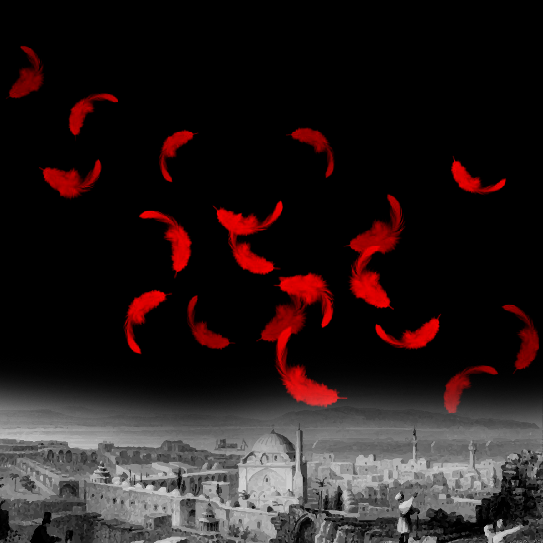 Art piece: The feathers of backbiting floating over 'Akká. One of the main activities that occupied the Azalís’ time was spreading rumors and misrepresentation, essentially backbiting, speaking poisonous words that sink deep into the fabric of society, with a ripple effect that can last years. Backbiting travels and can never be undone, like shaking a feather pillow above a city on a windy day and expecting to pick up every last feather. Source for the metaphor: Catholic Education Resource Center: The Feathers of gossip: How our words can build up or tear down. Source for the panoramic image of ‘Akká: An 1836 engraving of ‘Akká from the book Syria, The Holy Land, Asia Minor, &c. Illustrated by John Carne from Wikimedia Commons. © Violetta Zein.