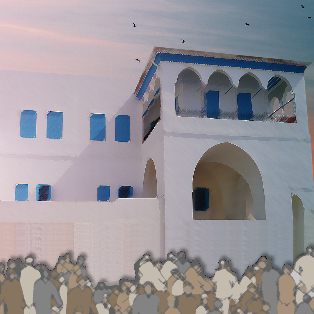 Artistic illustration of Bahá'í believers in ‘Akká, gathered together and waiting at sunset for Bahá'u'lláh to appear on the balcony of the house of ‘Abbúd and summon someone to His presence. Original photo from which the reconstruction was designed: Photograph of the house of ‘Abbúd by Zairon on Wikimedia Commons. © Violetta Zein.