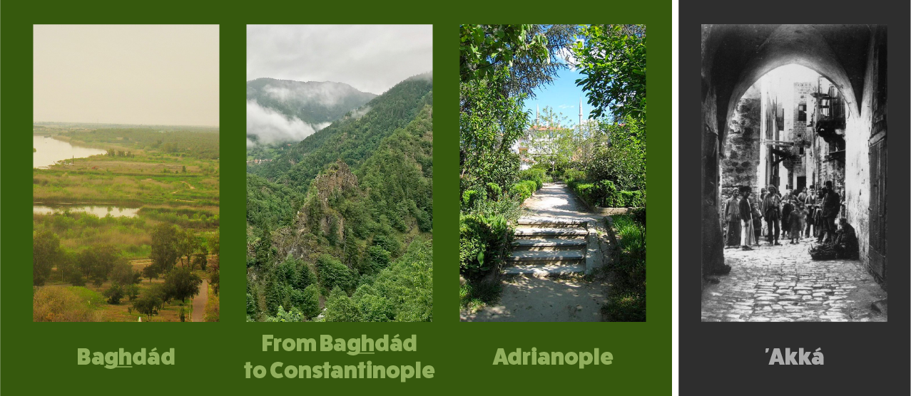The stark contrast between the greenery Bahá'u'lláh was able to enjoy, His trials and tribulations notwithstanding in Baghdád, on the banks of the Tigris (Wikimedia Commons), on His long between Baghdád and Sámsún (Wikimedia Commons), and in Adrianople (Wikimedia Commons). These places all appear vivid and bright compared to the grey and stone which Bahá'u'lláh gazed on for nine years in the prison-city of ‘Akká (Bahá'í Media Bank, Copyright © Bahá’í International Community.)