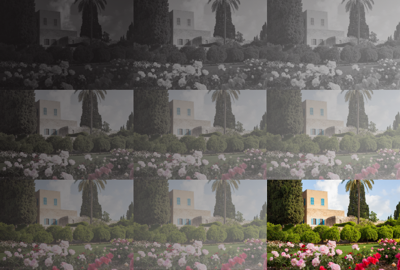 Nine progressively more color-saturated photographs of Mazra’ih culminating in the fully-saturated mansion in all its loveliness, to symbolize the repeated attempts of 'Abdu'l-Bahá and the Muftí of ‘Akká to convince Bahá'u'lláh to dwell in the little paradise and leave the gloomy city of ‘Akká. Many times, Bahá'u'lláh repeated “I am a prisoner.” Original photograph: Bahá'í Media Bank, Copyright © Bahá’í International Community.