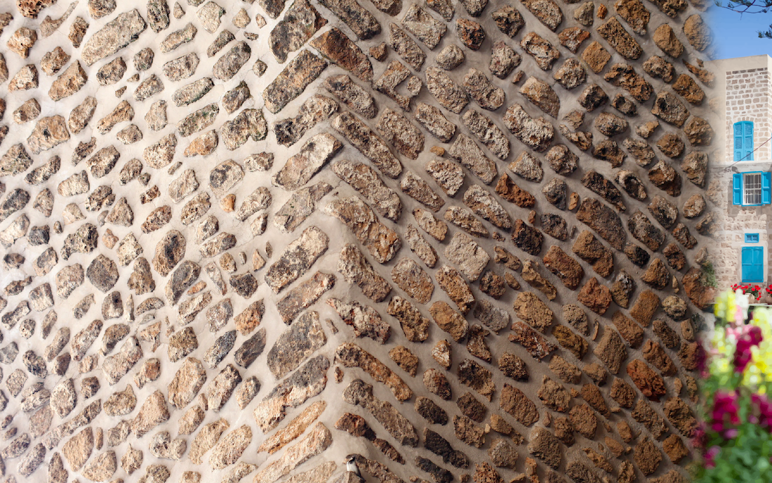 A symbolic interpretation of Bahá'u'lláh’s refusal to go beyond the walls, even as 'Abdu'l-Bahá offers Him the greenery and peace at Mazra’ih: the stone detail is from the land gate of ‘Akká (Bahá'í Media Bank), behind which Bahá'u'lláh chooses to remain, and beyond the gate, the small colorful portion is a detail of the greenery at Mazra’ih ( Bahá'í Media Bank, Copyright © Bahá’í International Community.)