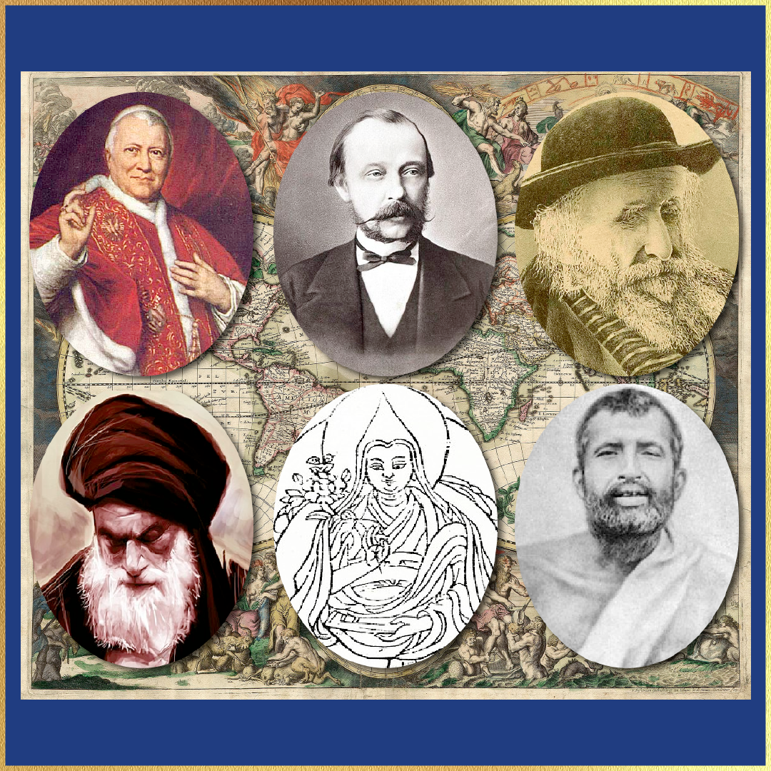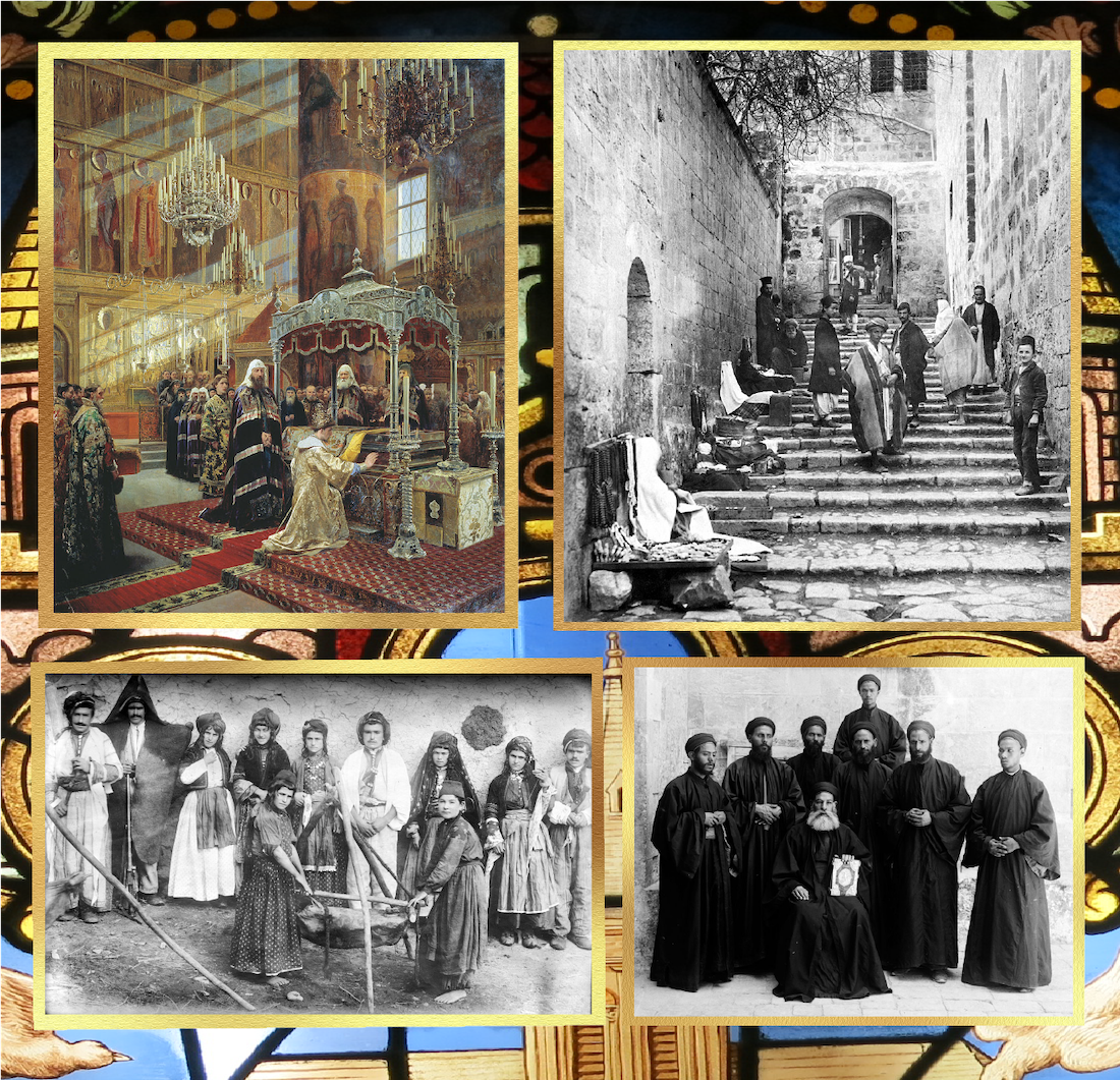 Four vignettes of 19th century Christianity around the world, on a background of a 19th century stained glass window from the church of Saint-Pierre-Saint-Paul in Colombes in France (Source): Young Czar Alexis praying before relics of Philip in the presence of Patriarch Nikon (Source), Street in the Christian neighborhood in Jerusalem, in 1870 (Source), Christian family making butter, Mawana, Persia (Source), Coptic monks between 1898 and 1914 (Source). All images from Wikimedia Commons.