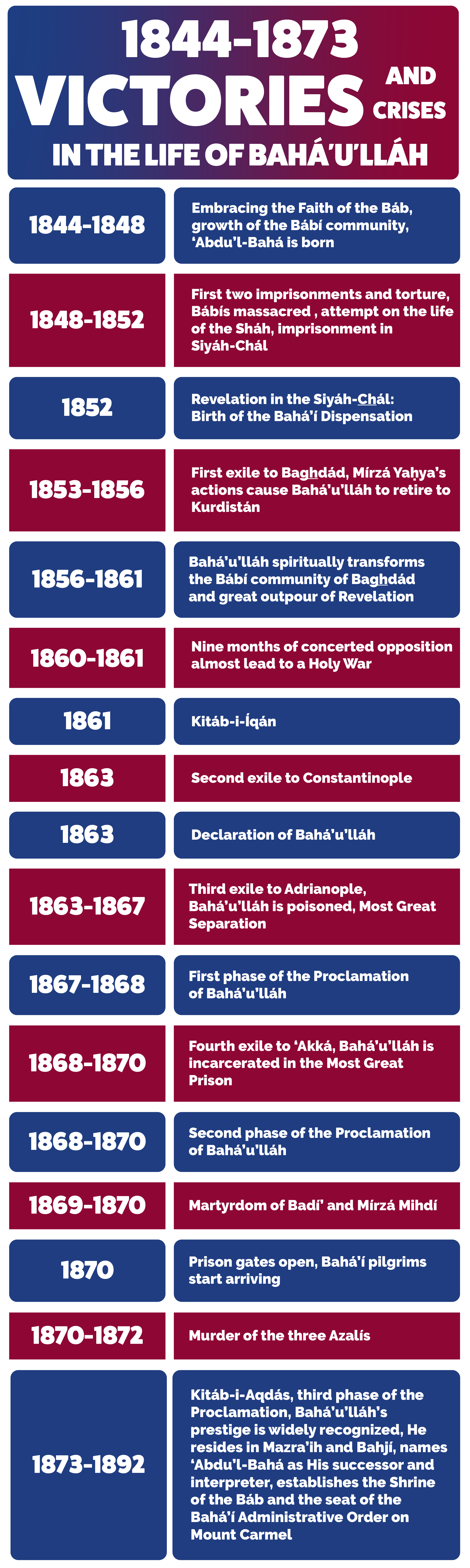 - September 1871 – Late 1873 : House of ‘Údí Khammár: Bahá'u'lláh moves into the house of ‘Údí Khammár: David S. Ruhe, Door of Hope: The Bahá’í Faith in the Holy Land, page 205. Late 1873: David S. Ruhe, Door of Hope: The Bahá’í Faith in the Holy Land, page 213.