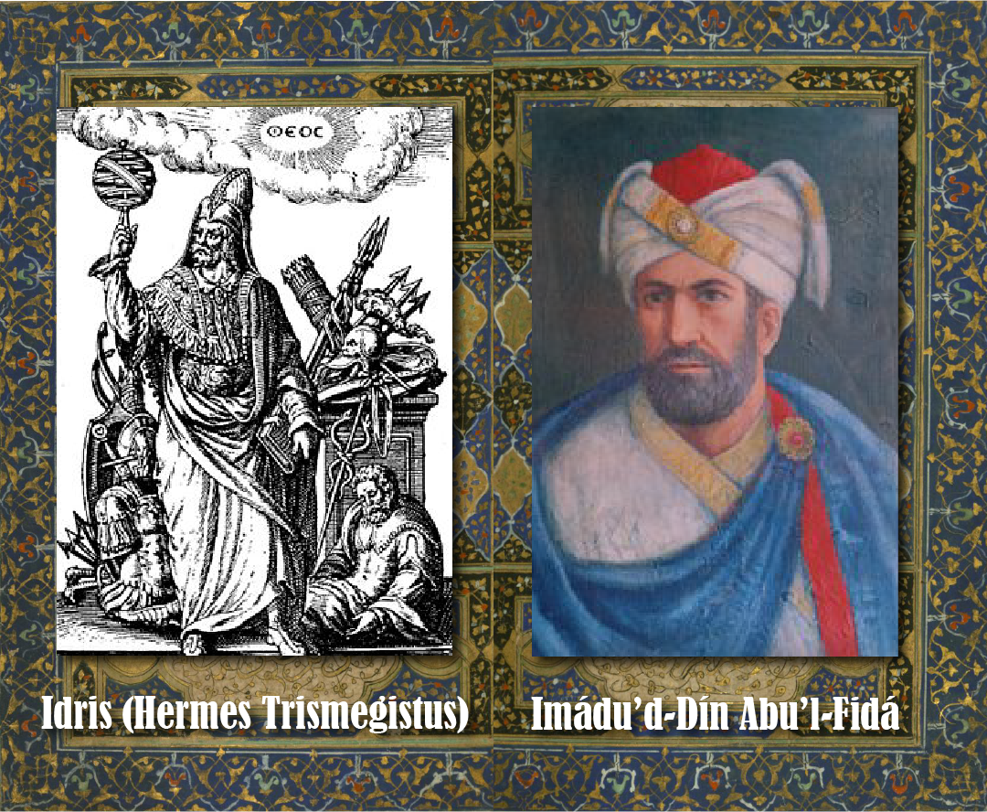An illustration of note 3 and note 4 of the Lawḥ-i-Ḥikmat on Bahá'í Reference Library, where Bahá'u'lláh’s discussion of Hermetic philosophy and Idrís (Hermes Hermes Trismegistus), and Bahá'u'lláh’s references to the work of Muslim historians Abu’l-Fatḥ-i-Sháhristání and Imádu’d-Dín Abu’l-Fidá. Black and white engraving of Idrís (Source), Painting of Imádu’d-Dín Abu’l-Fidá (Source), on a background created from the double-page illuminated frontispiece from Walters manuscript W.605 by Abu’l-Fatḥ-i-Sháhristání, (Source), all from Wikimedia Commons.