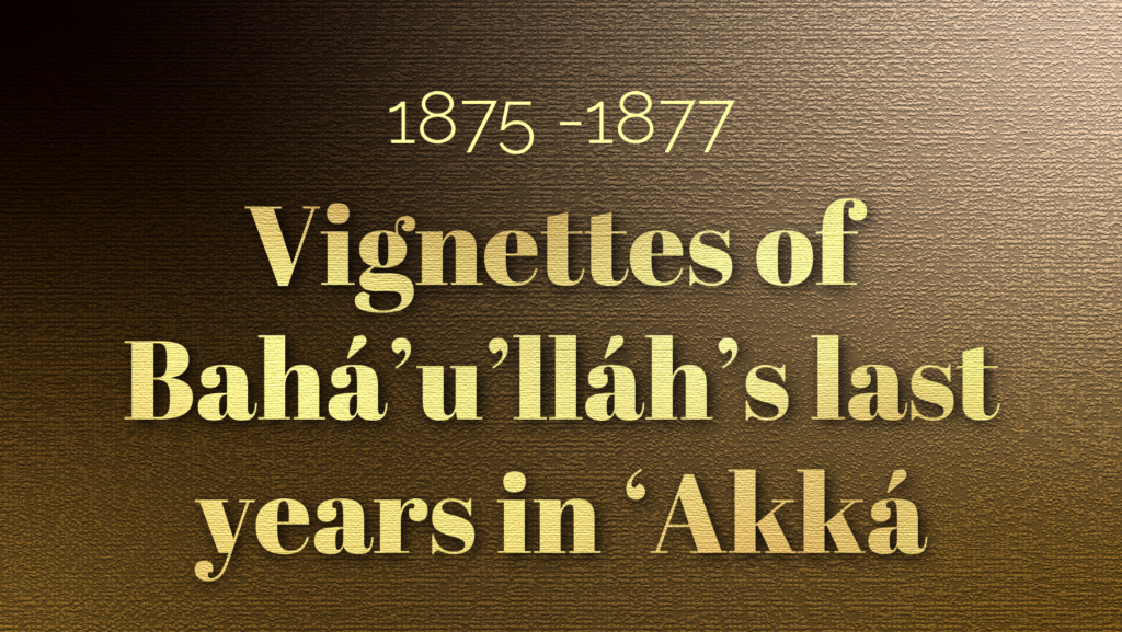 In early 1877, there were about 100 Bahá'ís in ‘Akká, residents and pilgrims combined, and most evenings the believers would gather in the street below Bahá'u'lláh’s balcony at the appointed time. Some stood, others sat and some believers walked around the house while they waited and gazed at Bahá'u'lláh, pacing.