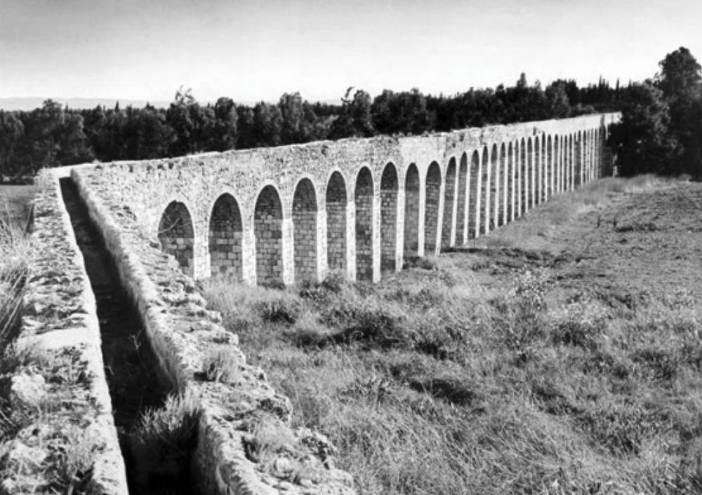 The aqueduct to carry water to ‘Akká was built in about 1815 to replace an earlier one destroyed by Napoleon. By the time of Bahá’u’lláh's arrival, it had fallen into disrepair. (Bahá'í World Centre archives, 1968). Baháu'lláh: A Photographic Narrative.