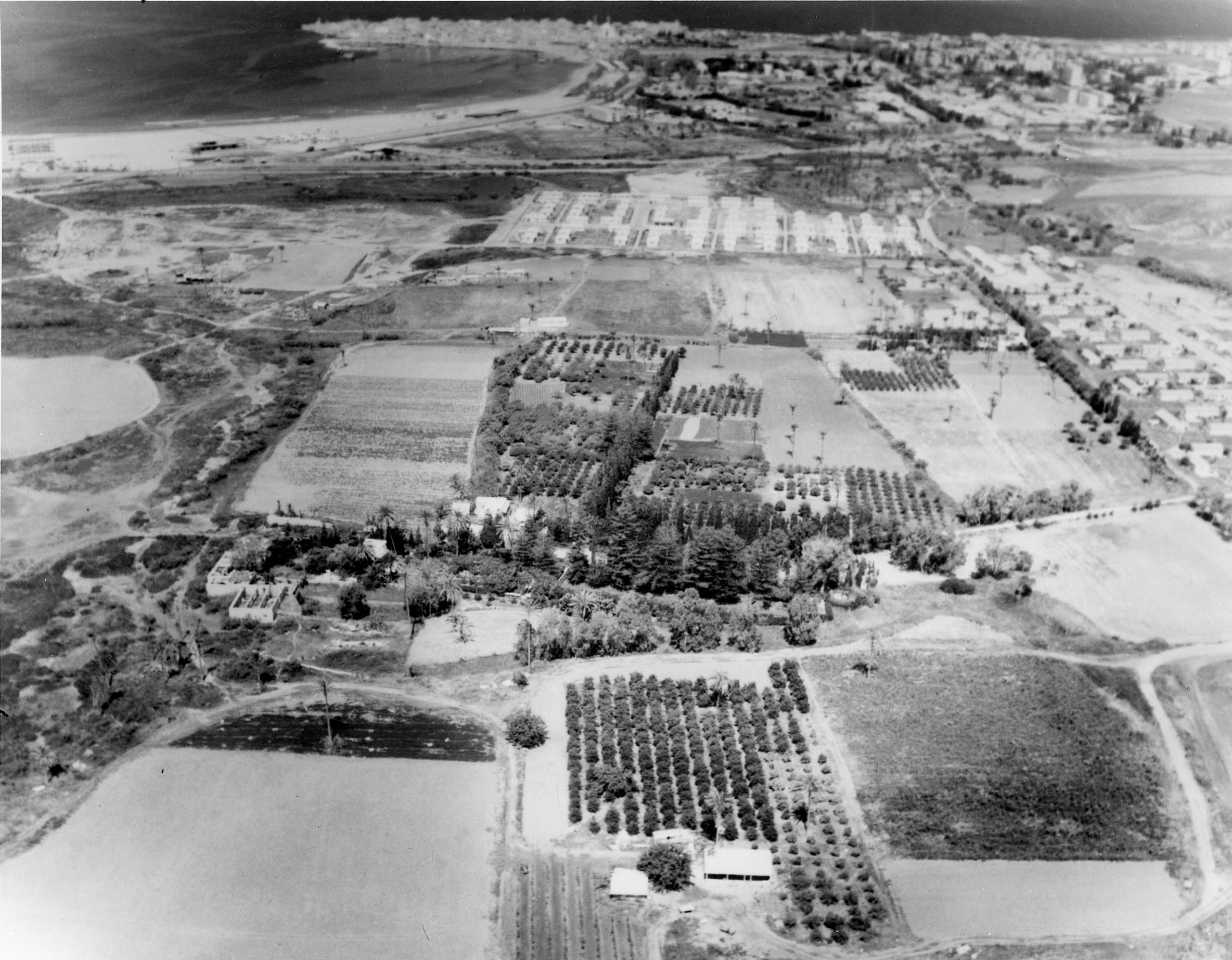 Aerial view of Riḍván Garden, May 1967. You can clearly see 'Akká at the top of the photograph. Bahá'í Media Bank.