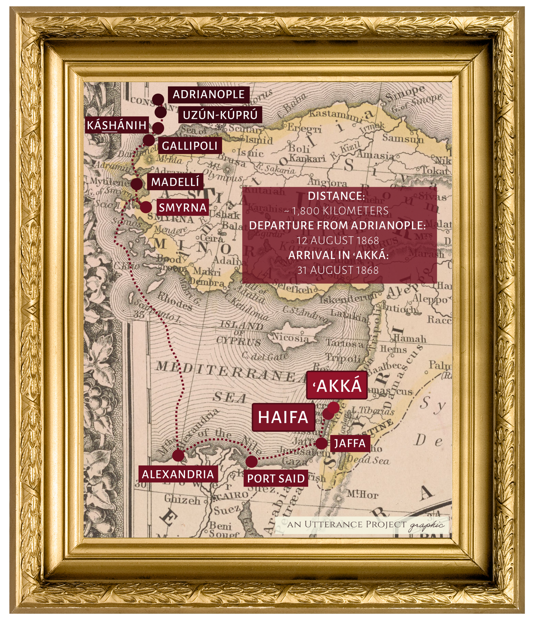 26 – 31 August 1868 – Alexandria to ‘Akká: Shoghi Effendi, God Passes By; details about the journey are from Myron H. Phelps, The Master in ‘Akká, page 70-72.