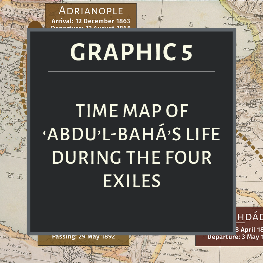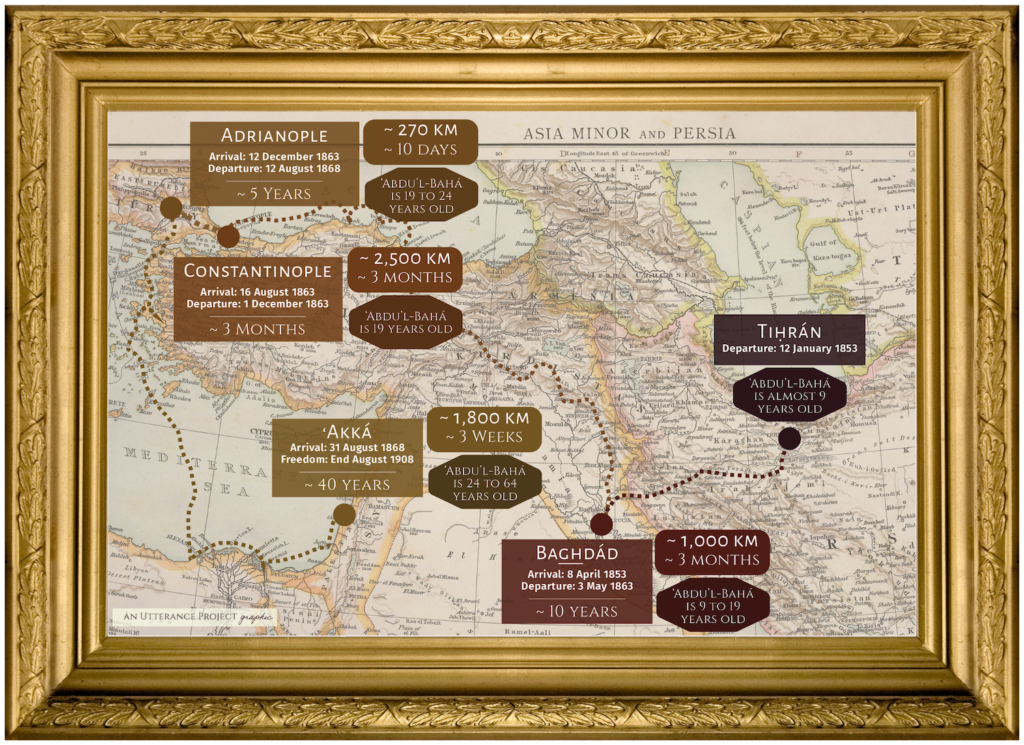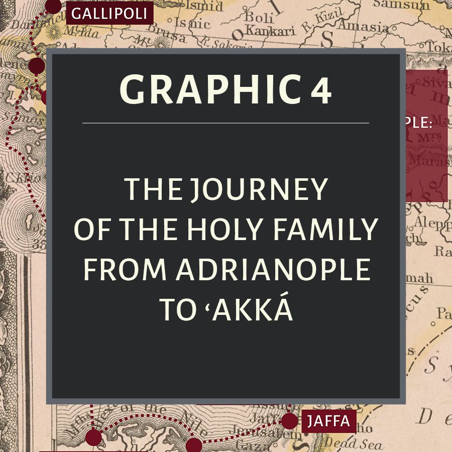 Map of the four Exiles of Bahá’u’lláh and the Holy Family from combined information in graphics 1, 2, 3 and 4. Original graphic by Violetta Zein. Map of Asia Minor and Persia in 1895 from ‘The Citizen’s Atlas of the World’, published in London, c.1899. Used with permission by https://www.britishempire.co.uk/