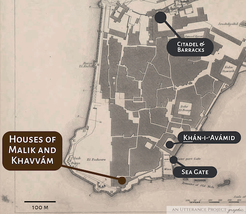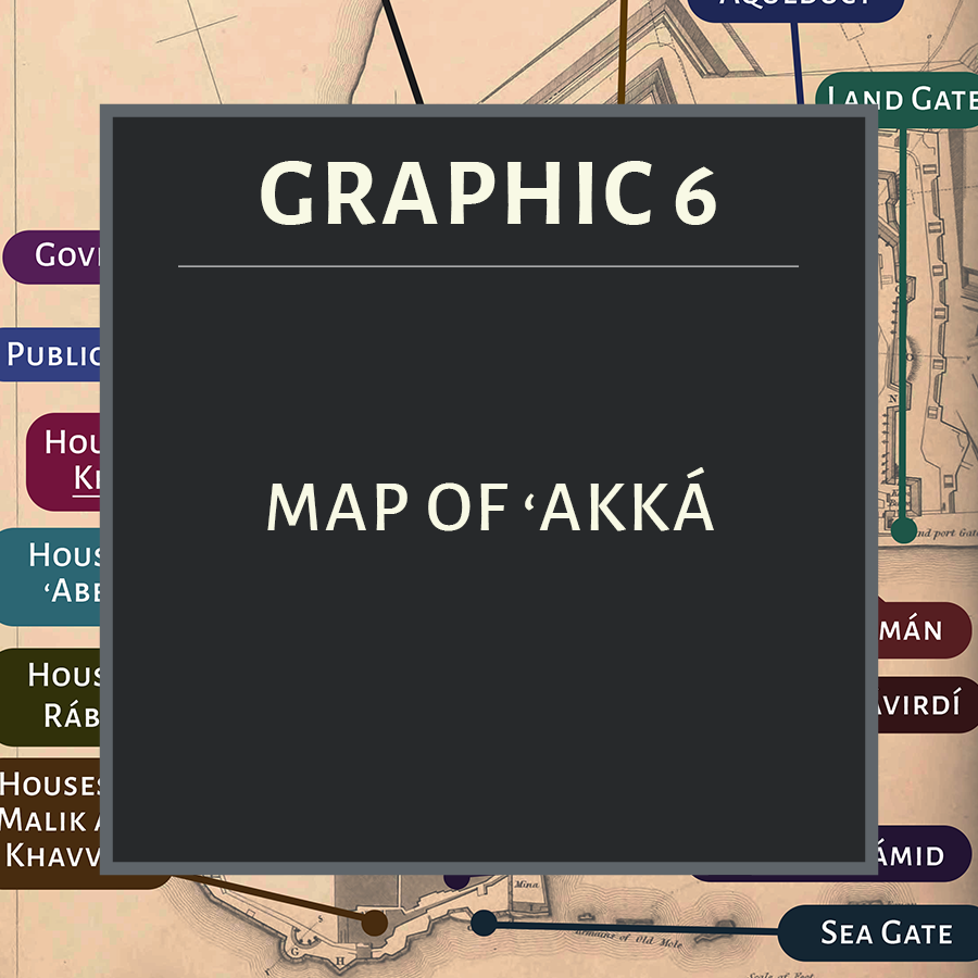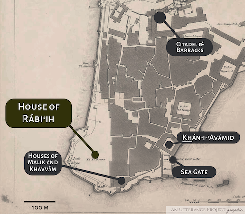 Three Covenant-Breakers Are Murdered: Balyuzi, H.M. Bahá’u’lláh: The King of Glory, pages 320-332, Taherzadeh, Adib. The Revelation of Bahá’u’lláh Volume III: ‘Akká, the Early Years (1868 – 1877) pages 234-236, Shoghi Effendi, God Passes By. Details about ‘Abdu’l-Bahá in chains from Lady Blomfield: The Chosen Highway. Calculations about the distance between the Limán and the house of ‘Údí Khammár are my approximative measurements on Google Maps, tracing the most direct path between the Limán and the house of ‘Údí Khammár along the pedestrian alleys indicated on the map.