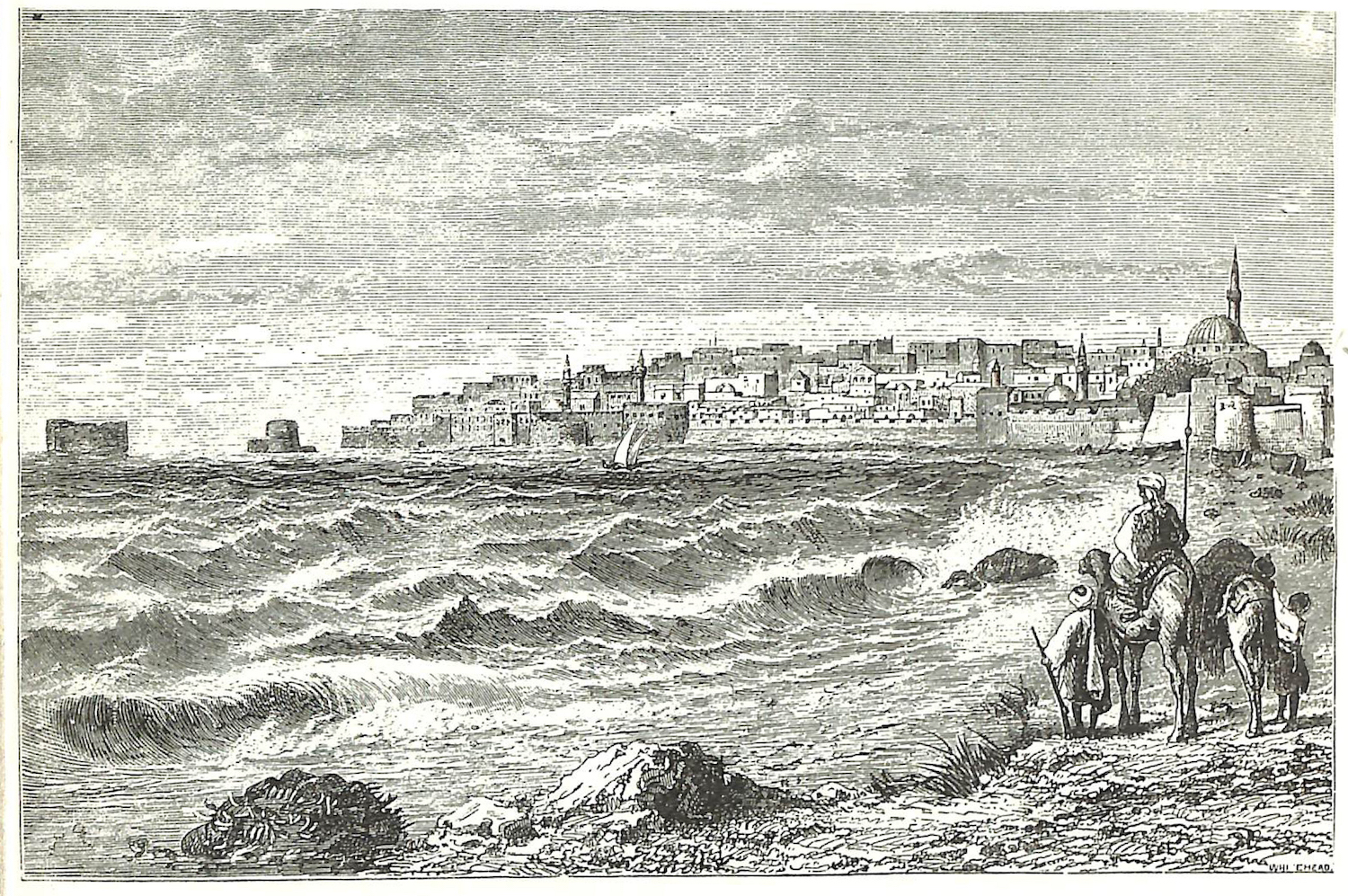 This drawing from a book published in the 1880s depicts 'Akká from a beach to the city’s west. The sea gate is near the left edge of the sea wall. (Source: W.M. Thompson, The Land and the Book). Bahá'í World News Service.