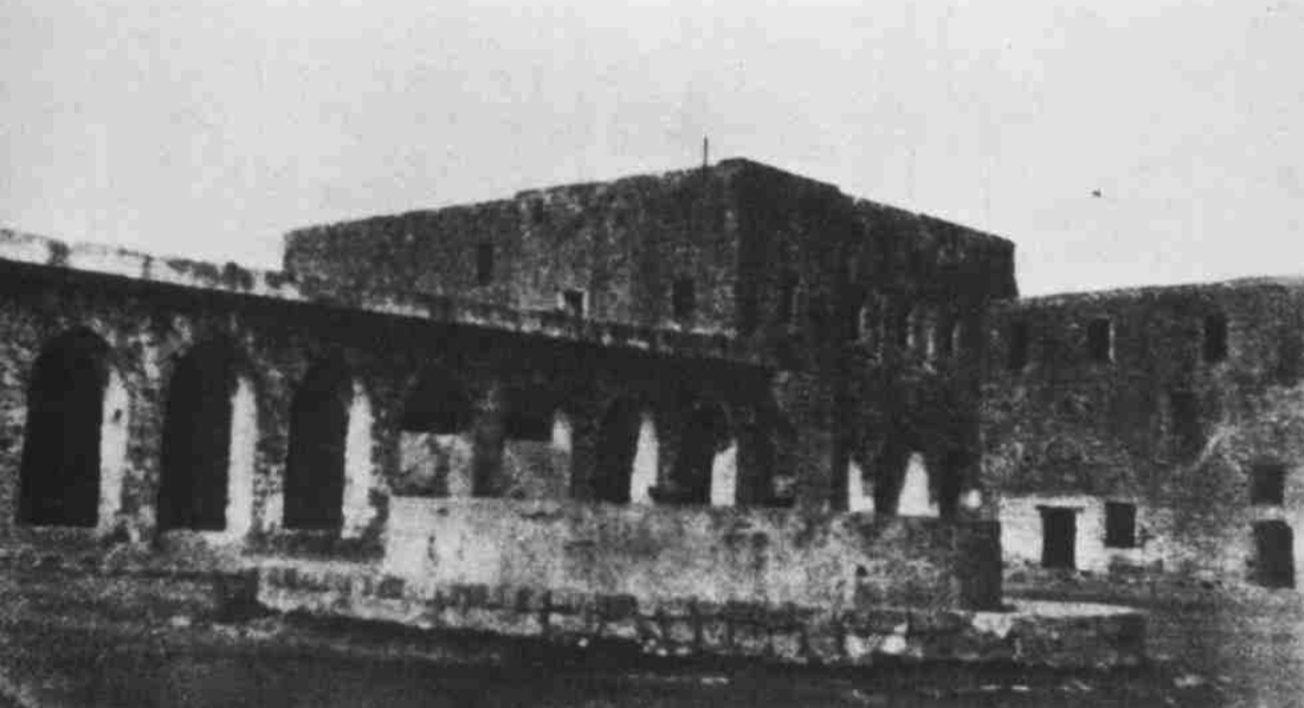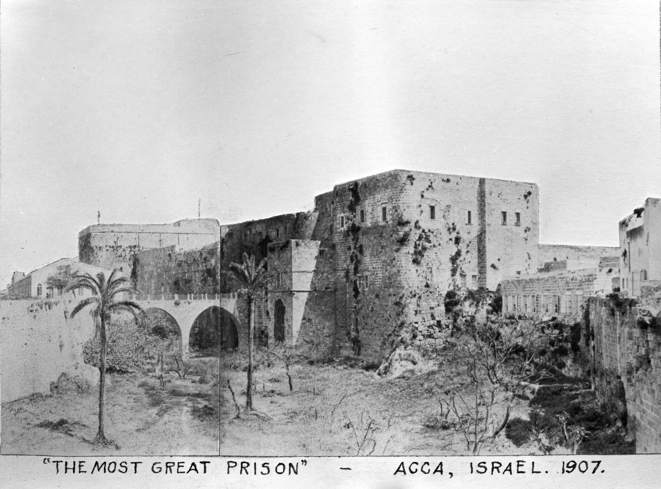 Prison of ‘Akká, where Bahá’u’lláh was incarcerated for a period of over two years -- the two windows farthest right on the second floor show the room that Bahá’u’lláh occupied in the prison, c. 1907. Bahá'í Media Bank.