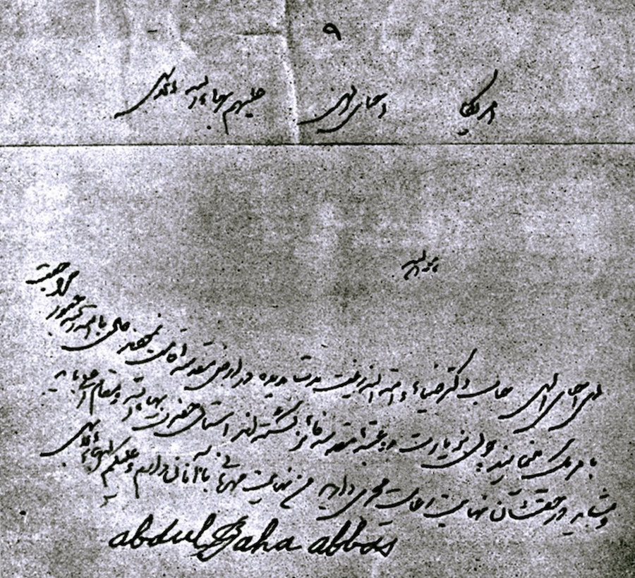 This Tablet was not written to Munírih Khánum, but it is a Tablet in ‘Abdu'l-Bahá's own handwriting and it as addressed to a Bahá'í Family, that of Zia Baghdadi, and was written around 1920. Source: Baha'i Sacred Relics.