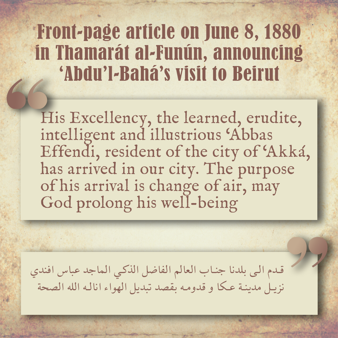 'Abdu'l-Bahá visits Beirut from June 1-17, 1880. His arrival, as is the custom in the region when any notable arrives in a city, is announced in the Beirut-based weekly Thamarát al-Funún newspaper on Tuesday 8 June 1880: