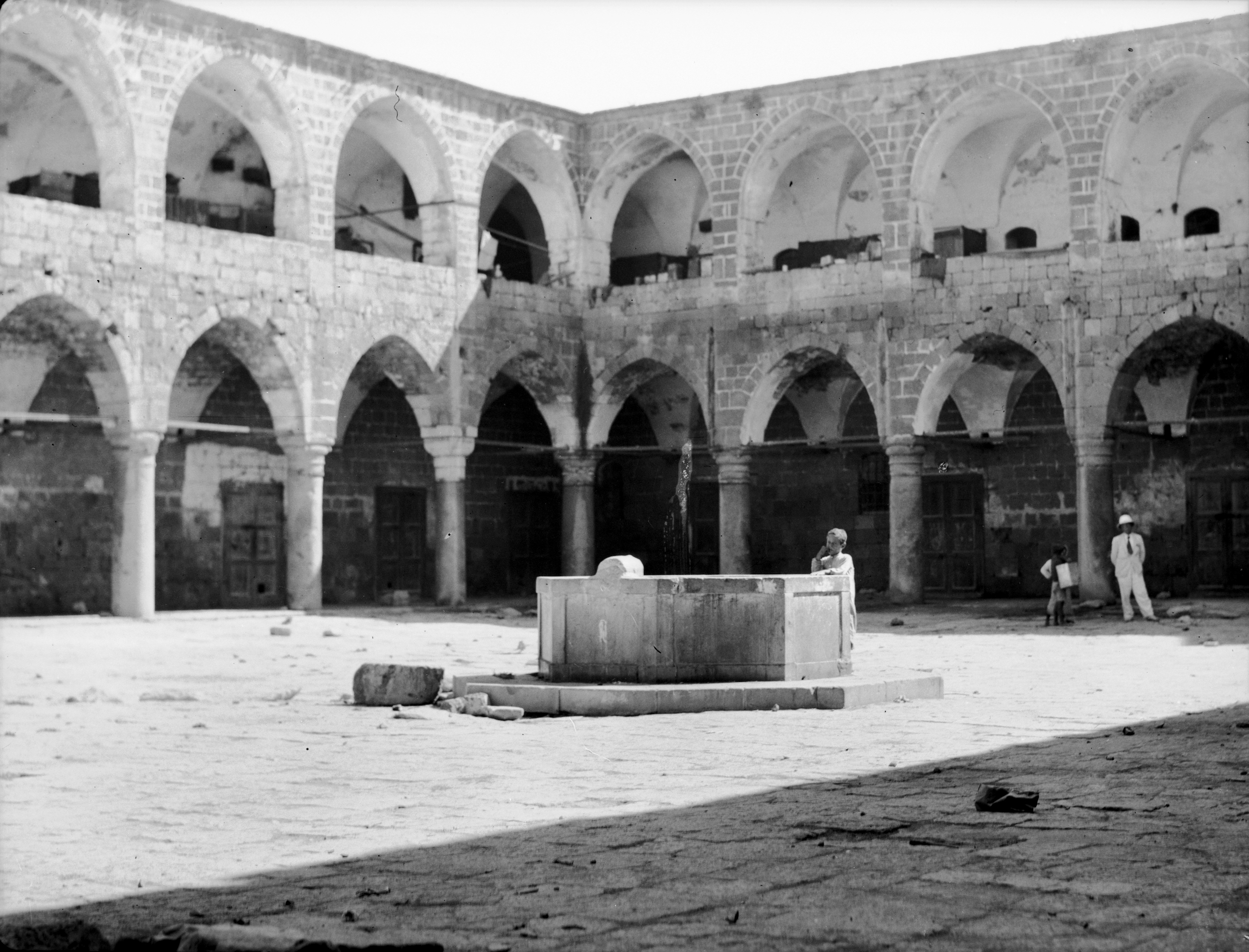 The Khán-i-Avámíd, a caravanserai in ‘Akká also known as Khán of the Pillars or Kahn al-Umdán sometime between 1920 and 1933. This is where the first Bahá'í Pilgrim House is located, and where most Bahá'ís were housed when the barracks were requisitioned in 1870. Matson Photograph collection, Library of Congress. Wikimedia Commons.