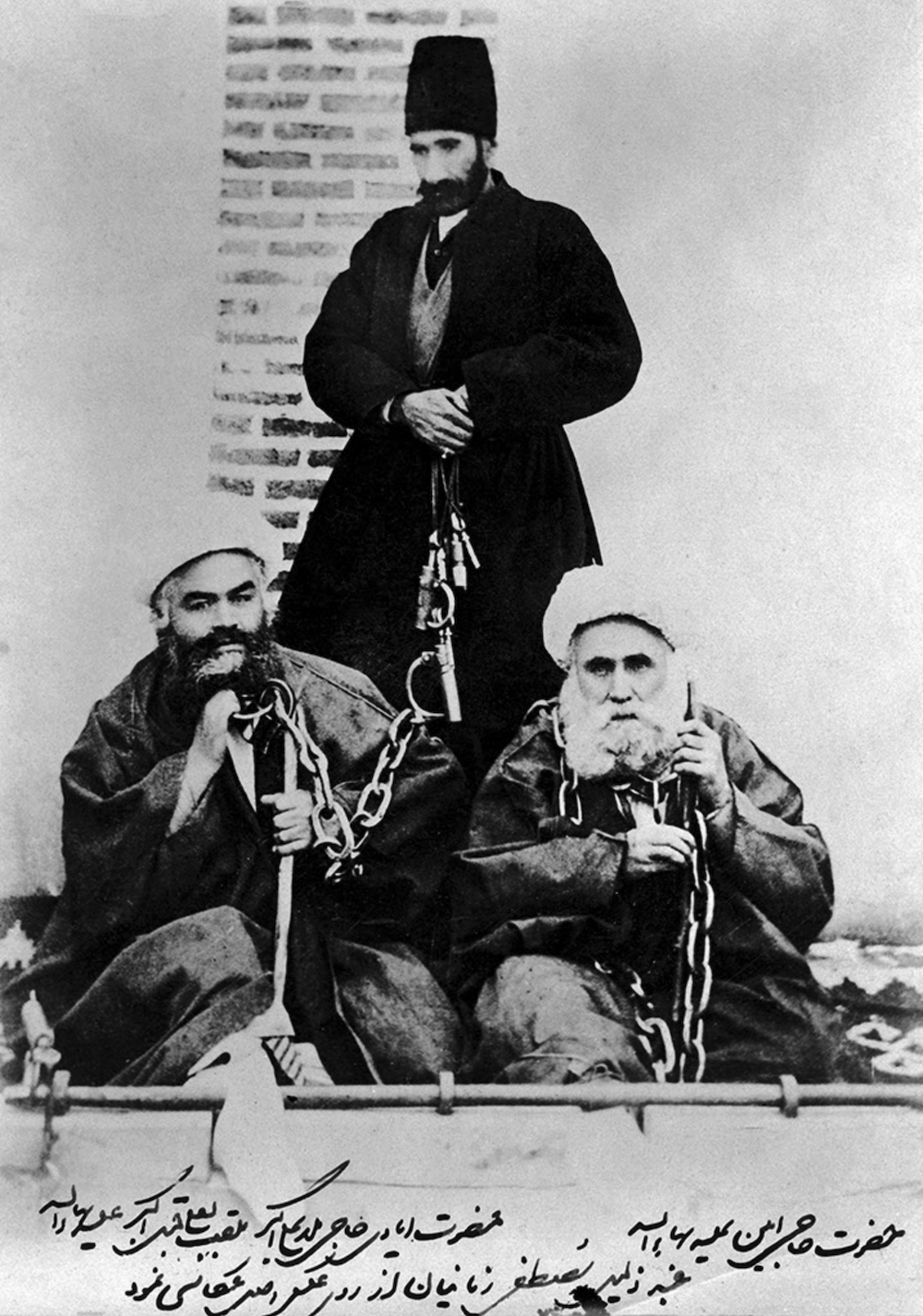 Hájí Ákhúnd, and Hájí Amín in the prison of Qazvín. Their feet are in stocks, their necks are in chains and the gaoler is in attendance. Source: Archives of Bahá'í Persecution in Iran.