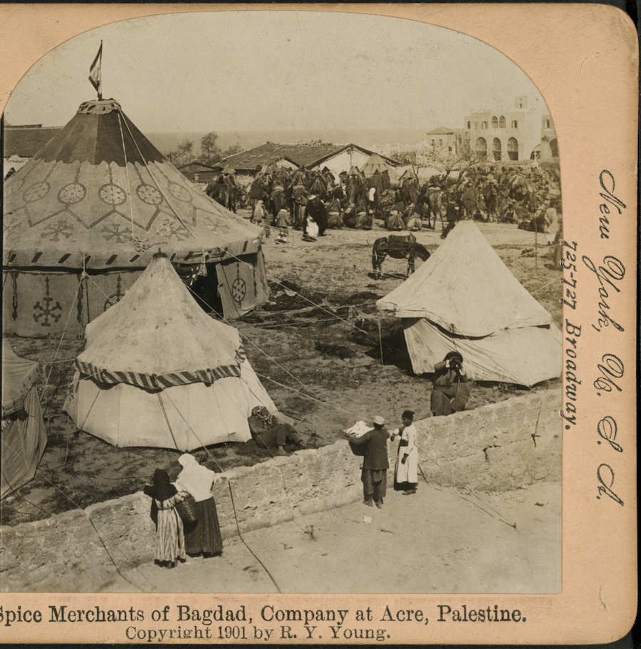 This picture of spice merchants from Baghdád in 'Akká circa 1901 is taken about twenty years after this period, but the merchant tents and the people milling in the background give an idea of the type of people 'Abdu'l-Bahá would have interacted with every day. Photograph by American Stereoscopic Company. Library of Congress.