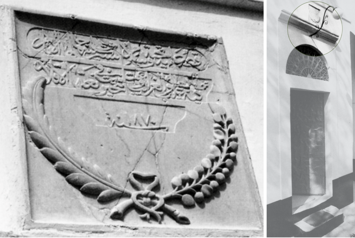 Left: Close up photograph of the inscription engraved in stone placed by 'Udi Khammár above the entrance door to Bahjí. Right: Entrance door to the Mansion of Bahjí. The inscription by 'Udí Khámmar is the small stone carving above the curved metal decoration of the door, behind the lamp, in the spotlighted area. Both photographs provided courtesy of George Ronald Publishers and used with permission.