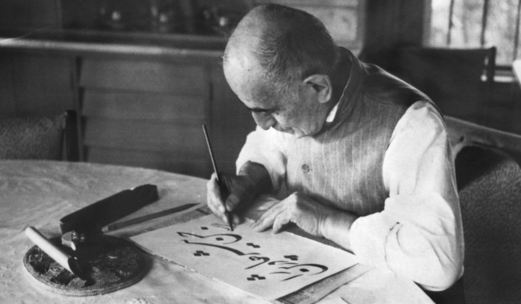 Ṭaráẓu'll‘áh Samandárí (protagonist of the story below), the son of the Hand of the Cause Samandar, and Hand of the Cause himself, seen here practising calligraphy in 1966. Source: Brilliant Star Magazine.
