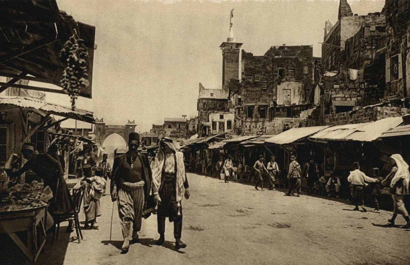 A city street scene in Beirut in the 1890s, ten years after 'Abdu'l-Bahá's visit. The way people are dressed and the stalls and buildings would be very close to exactly the same as what 'Abdu'l-Bahá would have seen in 1880. Old Beirut Blog (website closed). Accessed 2021/01/09.